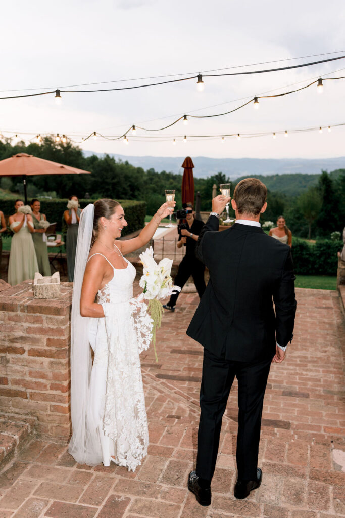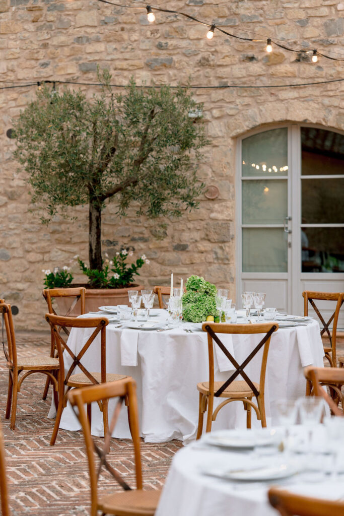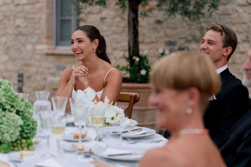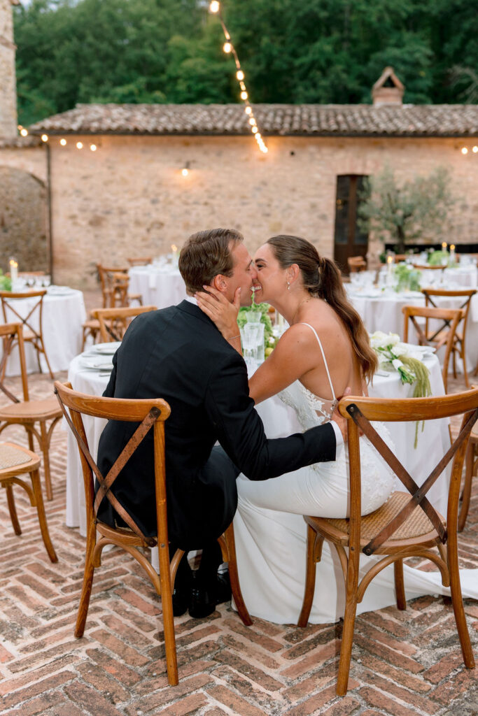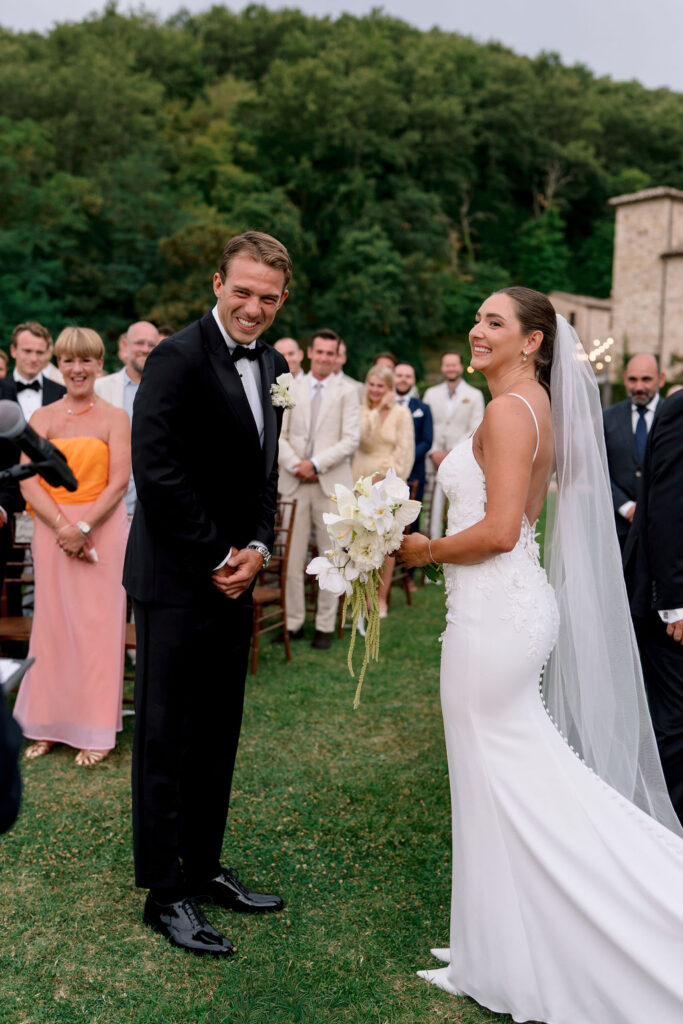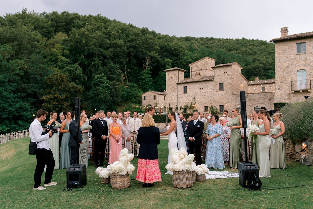 The wedding day itself came with a little drama. An approaching storm that threatened to disrupt plans for a fully outdoor celebration at SPAO Borgo San Pietro. Every part of the day had been designed to take place outside, from the ceremony through to the alfresco dining and evening party, so there was a collective sense of anticipation watching the skies. In a last-minute decision, the ceremony was pushed back by an hour to avoid the drizzle. And somehow, it worked. While the skies remained moody and distant thunder rumbled in the background, the rain mostly held off, allowing the entire wedding to unfold exactly as planned, entirely outdoors at SPAO Borgo San Pietro.