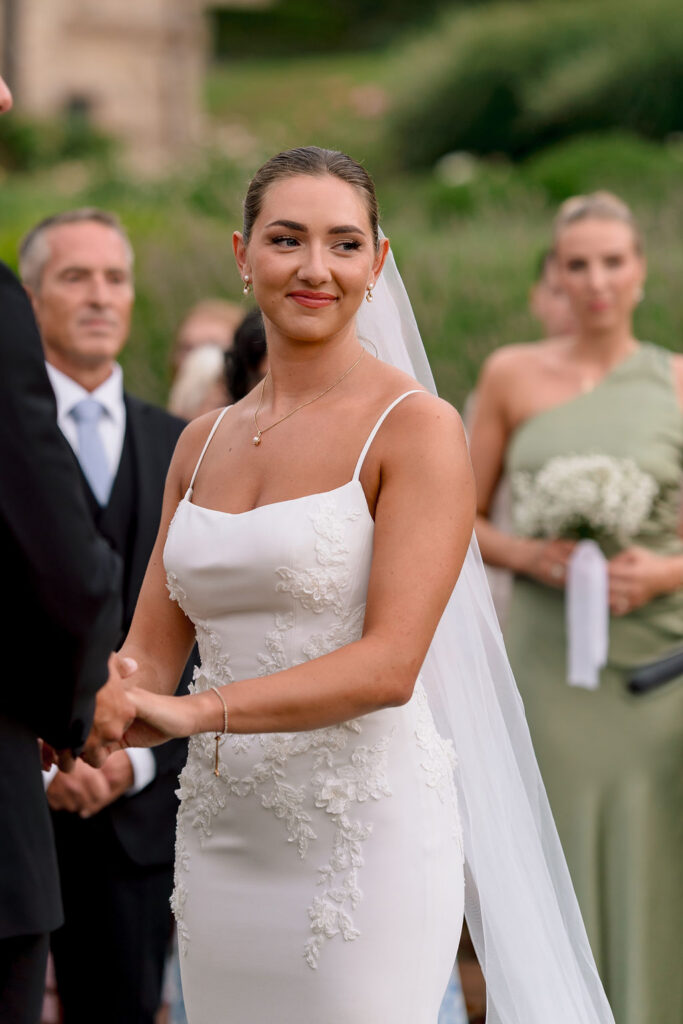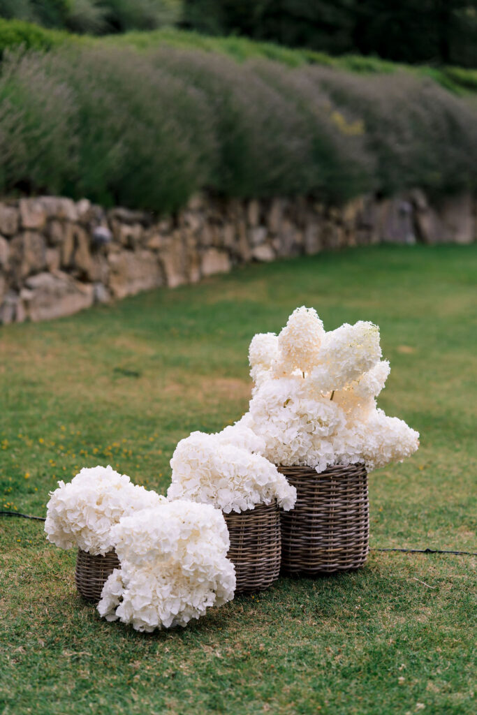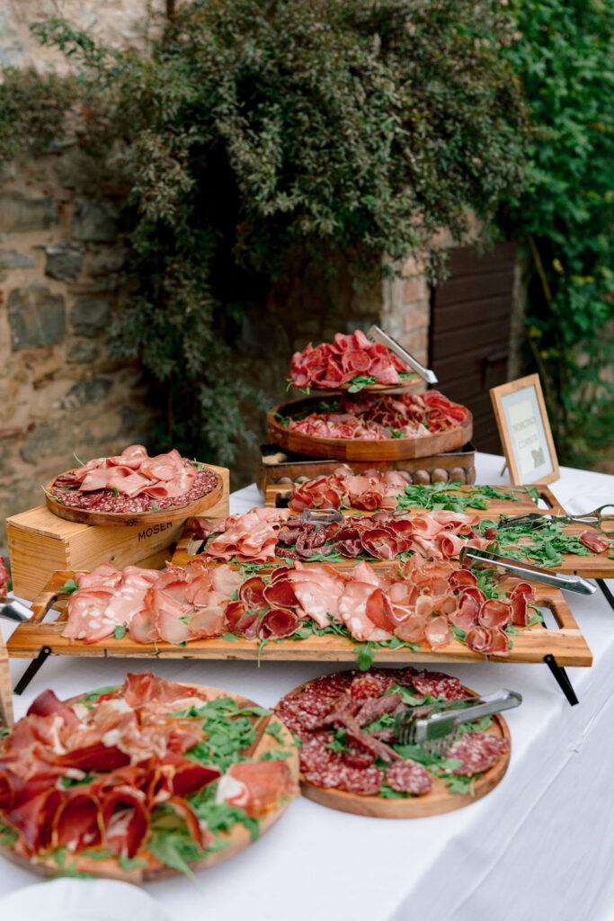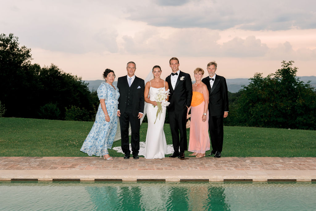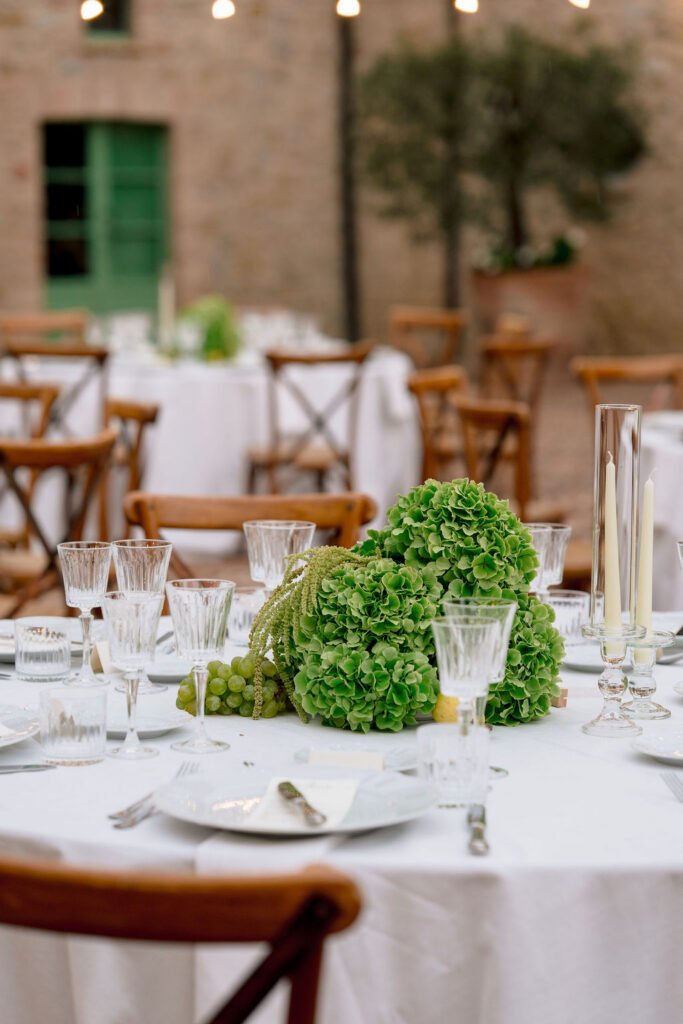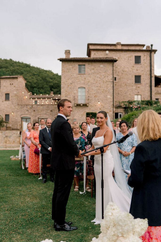 The wedding day itself came with a little drama. An approaching storm that threatened to disrupt plans for a fully outdoor celebration at SPAO Borgo San Pietro. Every part of the day had been designed to take place outside, from the ceremony through to the alfresco dining and evening party, so there was a collective sense of anticipation watching the skies. In a last-minute decision, the ceremony was pushed back by an hour to avoid the drizzle. And somehow, it worked. While the skies remained moody and distant thunder rumbled in the background, the rain mostly held off, allowing the entire wedding to unfold exactly as planned, entirely outdoors at SPAO Borgo San Pietro.