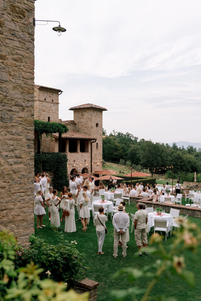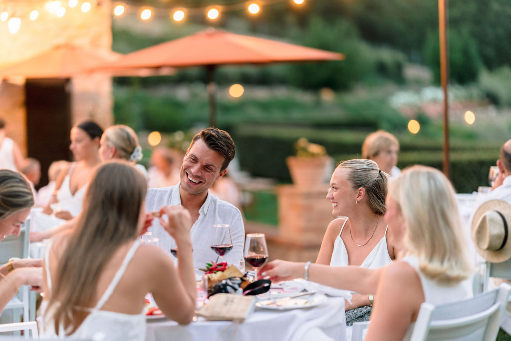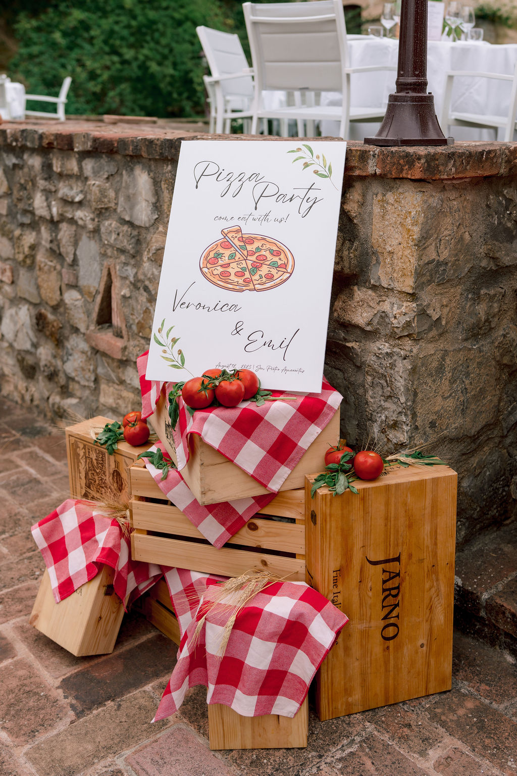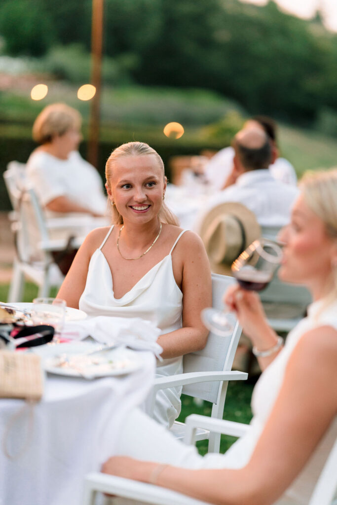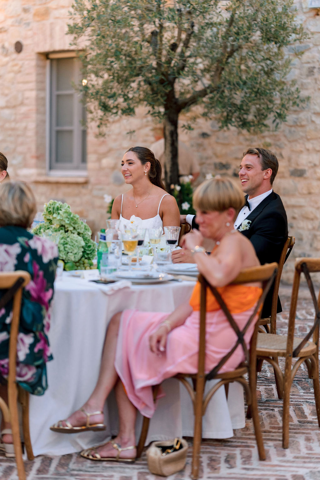 The celebrations began the evening before with a relaxed and stylish rehearsal dinner at SPAO Borgo San Pietro. Guests embraced an all-white dress code, creating a beautifully cohesive and effortlessly chic atmosphere against the warm tones of the Umbrian countryside. In contrast, Emil stood out in classic black, while Veronica completely stole the show in a stunning pink look. Such a fun and confident choice that perfectly set the tone for the weekend ahead. The evening unfolded as a laid-back pizza party, with long tables, flowing drinks, and that unmistakable pre-wedding buzz. It was the perfect way for everyone to settle in, connect, and soak up the magic of being together in Italy before the main event.