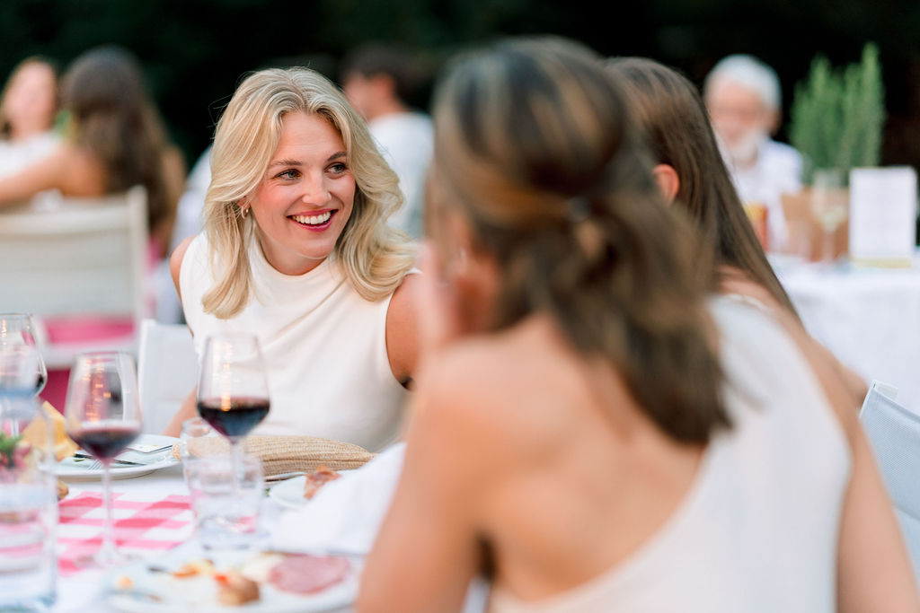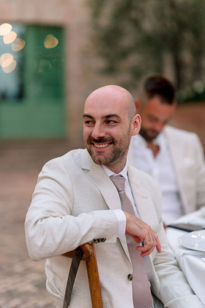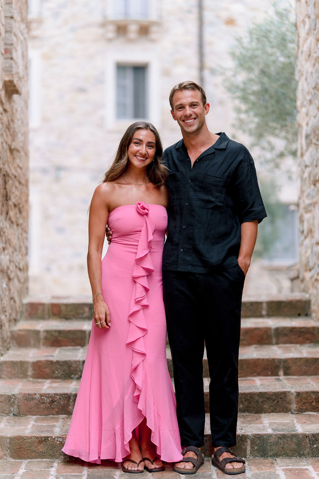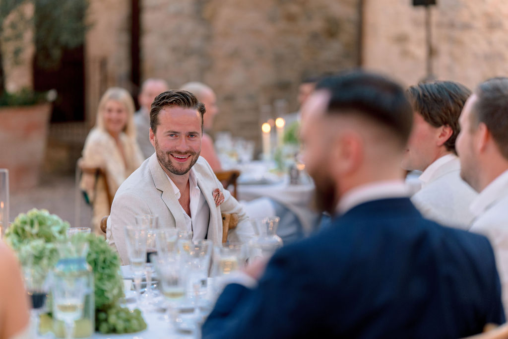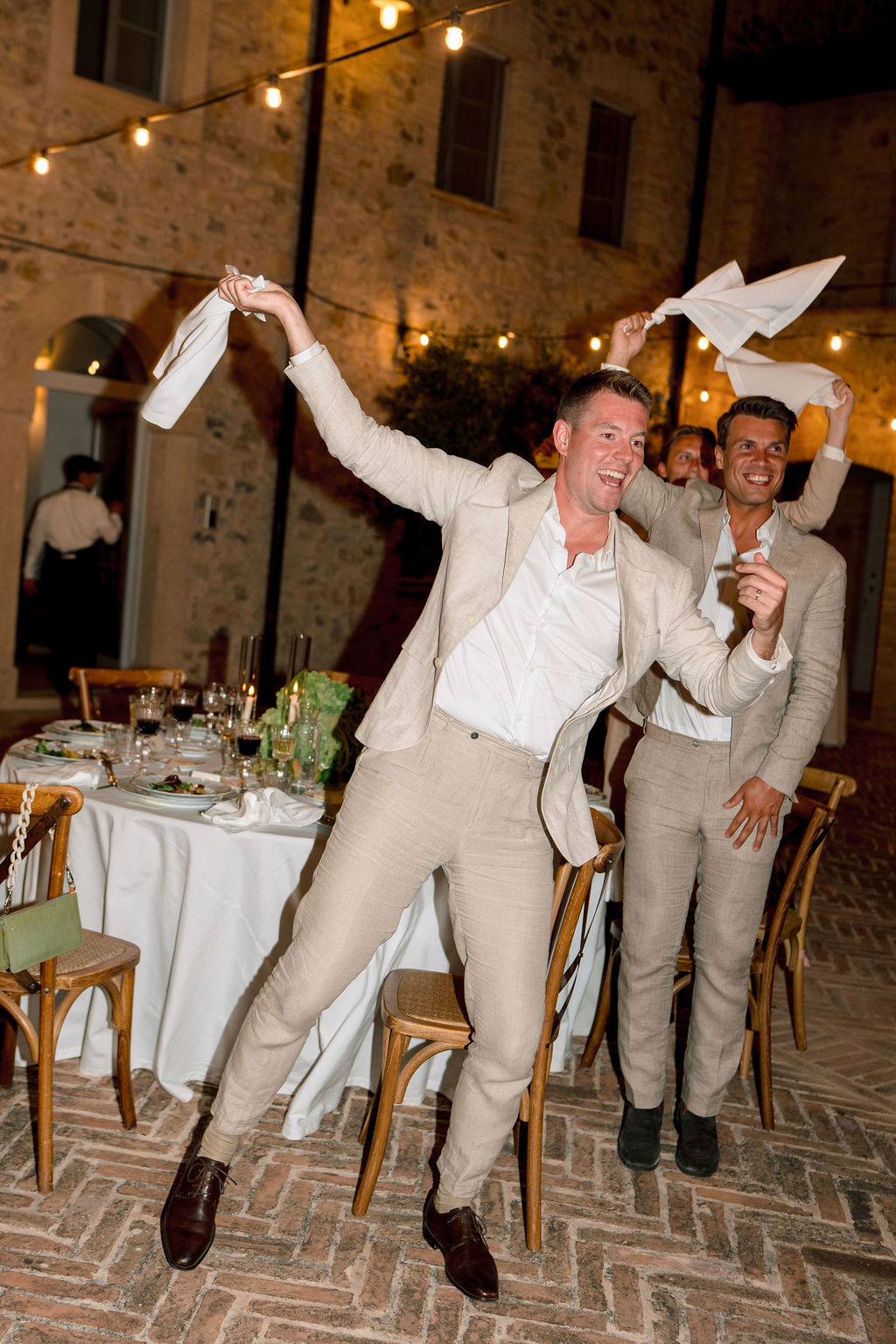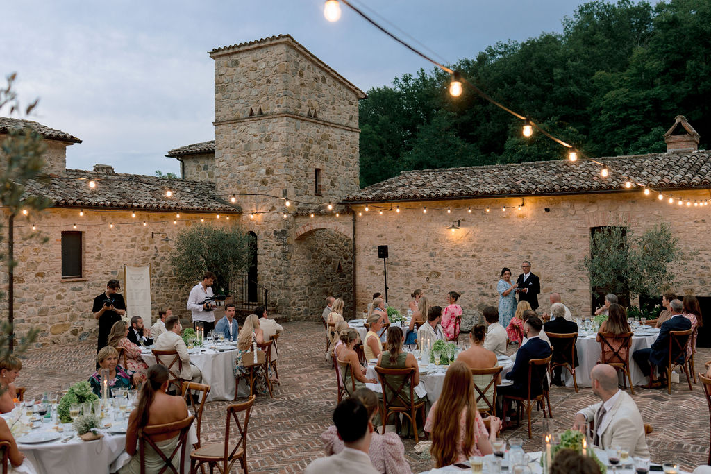 The celebrations began the evening before with a relaxed and stylish rehearsal dinner at SPAO Borgo San Pietro. Guests embraced an all-white dress code, creating a beautifully cohesive and effortlessly chic atmosphere against the warm tones of the Umbrian countryside. In contrast, Emil stood out in classic black, while Veronica completely stole the show in a stunning pink look. Such a fun and confident choice that perfectly set the tone for the weekend ahead. The evening unfolded as a laid-back pizza party, with long tables, flowing drinks, and that unmistakable pre-wedding buzz. It was the perfect way for everyone to settle in, connect, and soak up the magic of being together in Italy before the main event.