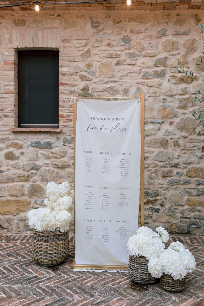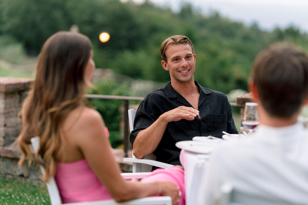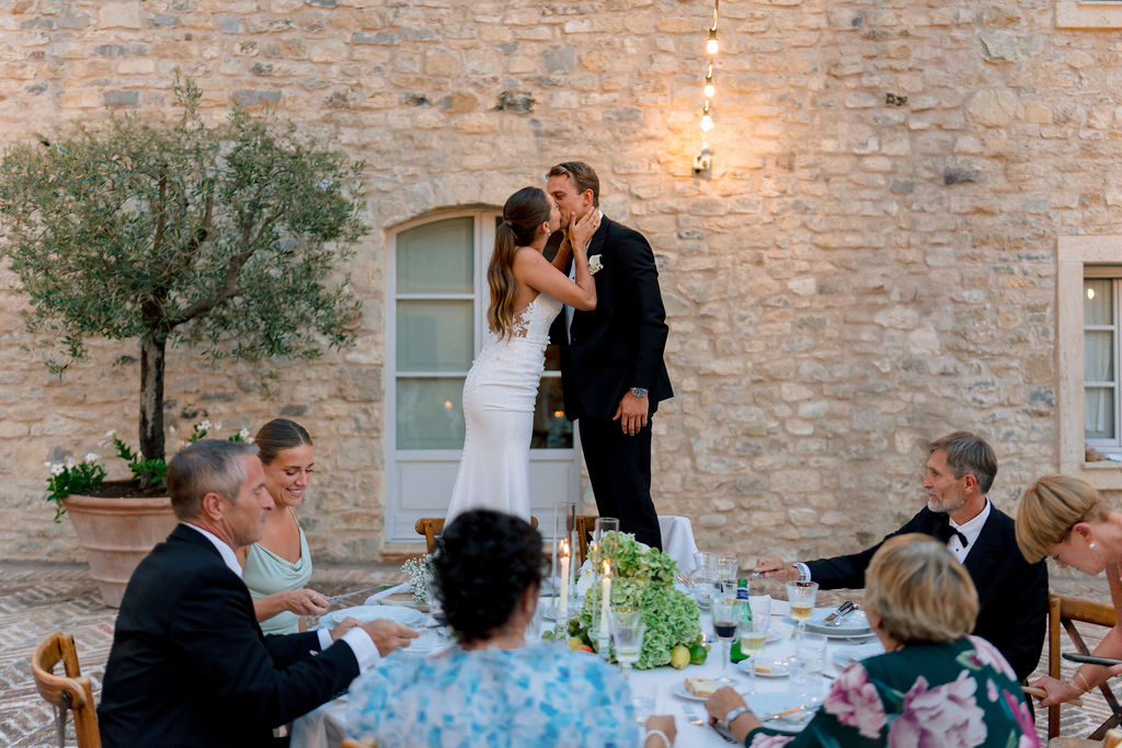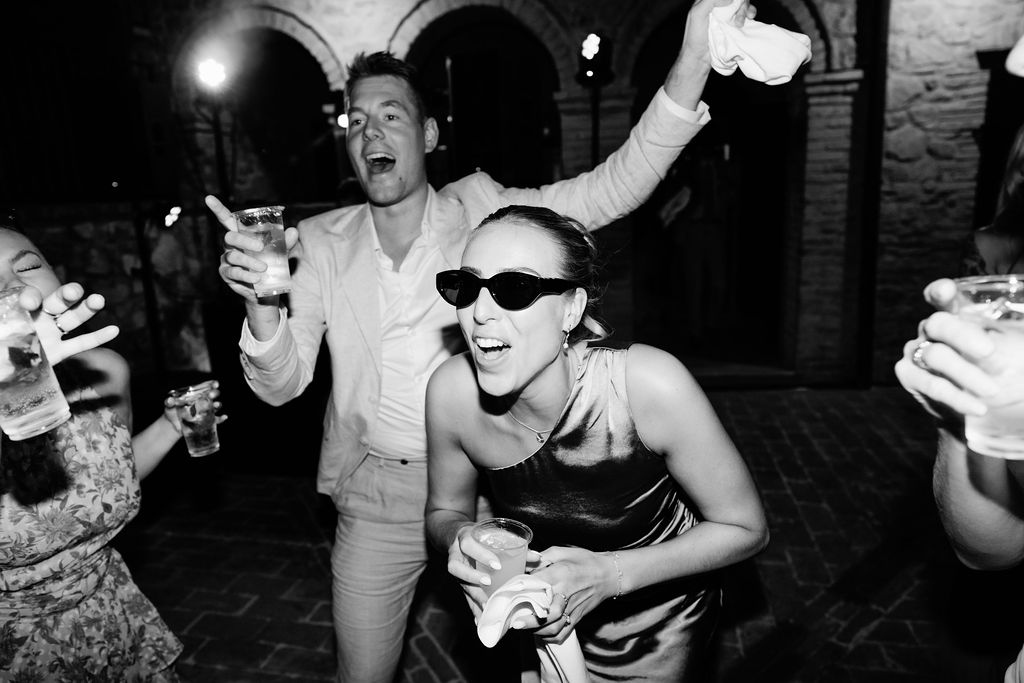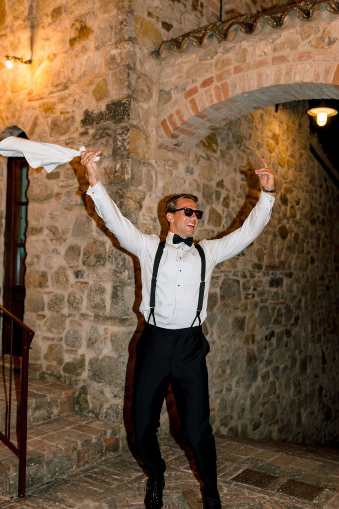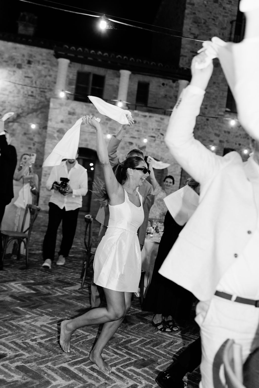 The celebrations began the evening before with a relaxed and stylish rehearsal dinner at SPAO Borgo San Pietro. Guests embraced an all-white dress code, creating a beautifully cohesive and effortlessly chic atmosphere against the warm tones of the Umbrian countryside. In contrast, Emil stood out in classic black, while Veronica completely stole the show in a stunning pink look. Such a fun and confident choice that perfectly set the tone for the weekend ahead. The evening unfolded as a laid-back pizza party, with long tables, flowing drinks, and that unmistakable pre-wedding buzz. It was the perfect way for everyone to settle in, connect, and soak up the magic of being together in Italy before the main event.