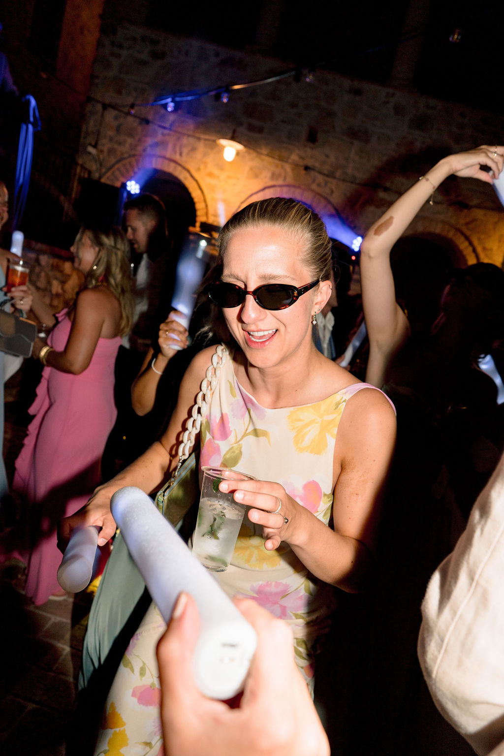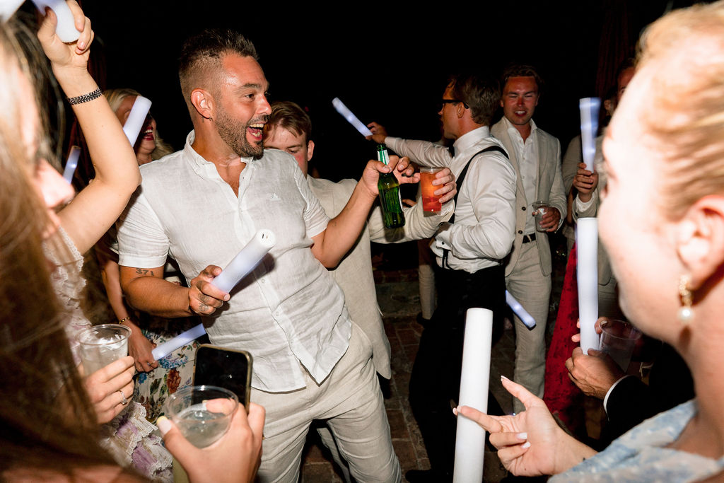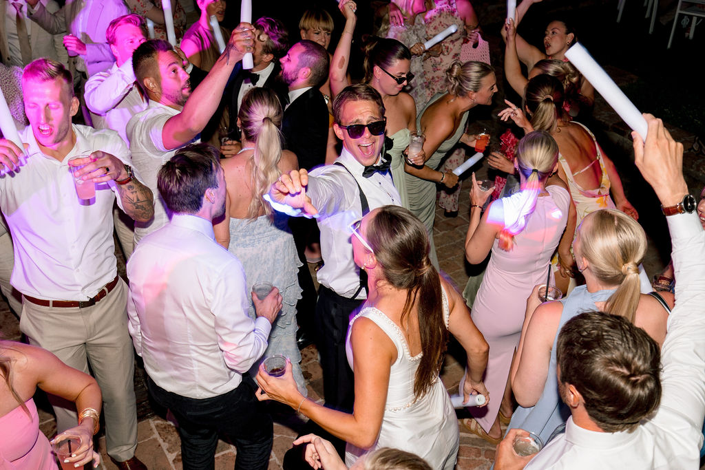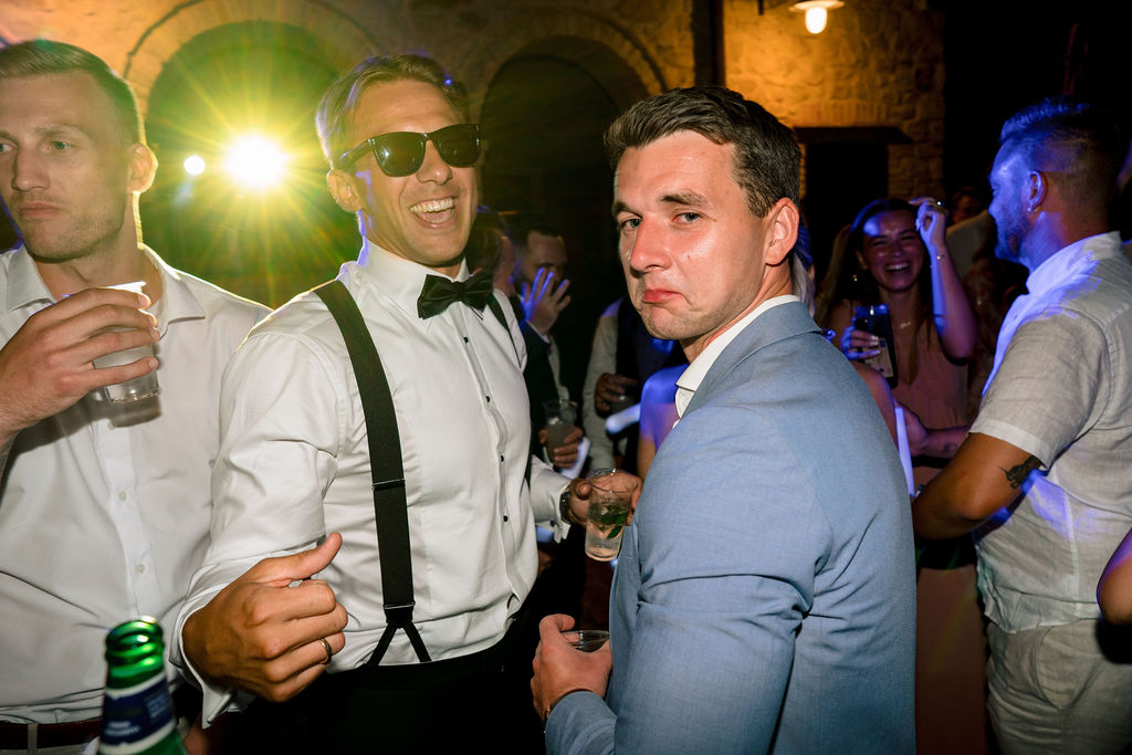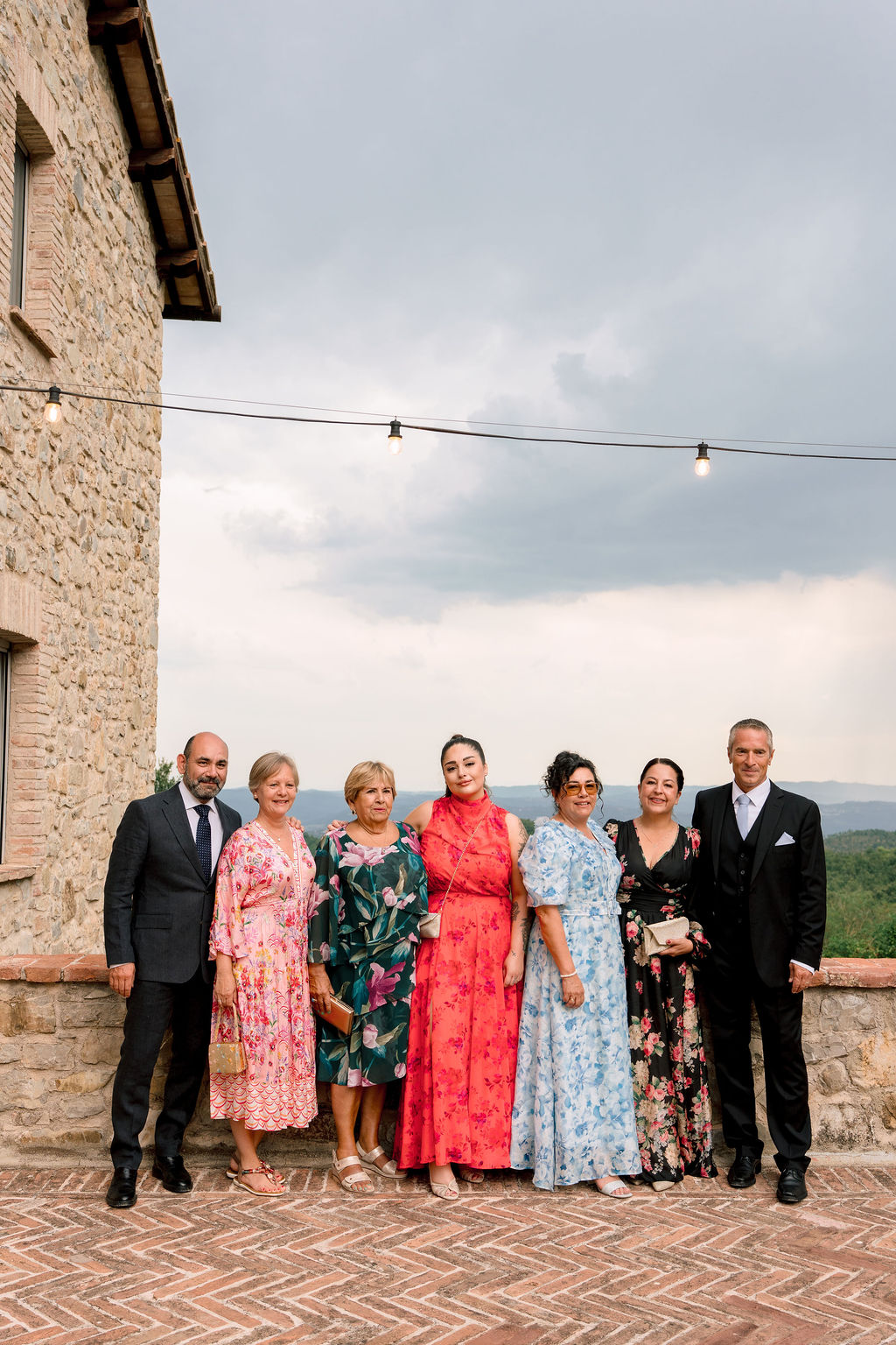 The celebrations began the evening before with a relaxed and stylish rehearsal dinner at SPAO Borgo San Pietro. Guests embraced an all-white dress code, creating a beautifully cohesive and effortlessly chic atmosphere against the warm tones of the Umbrian countryside. In contrast, Emil stood out in classic black, while Veronica completely stole the show in a stunning pink look. Such a fun and confident choice that perfectly set the tone for the weekend ahead. The evening unfolded as a laid-back pizza party, with long tables, flowing drinks, and that unmistakable pre-wedding buzz. It was the perfect way for everyone to settle in, connect, and soak up the magic of being together in Italy before the main event.