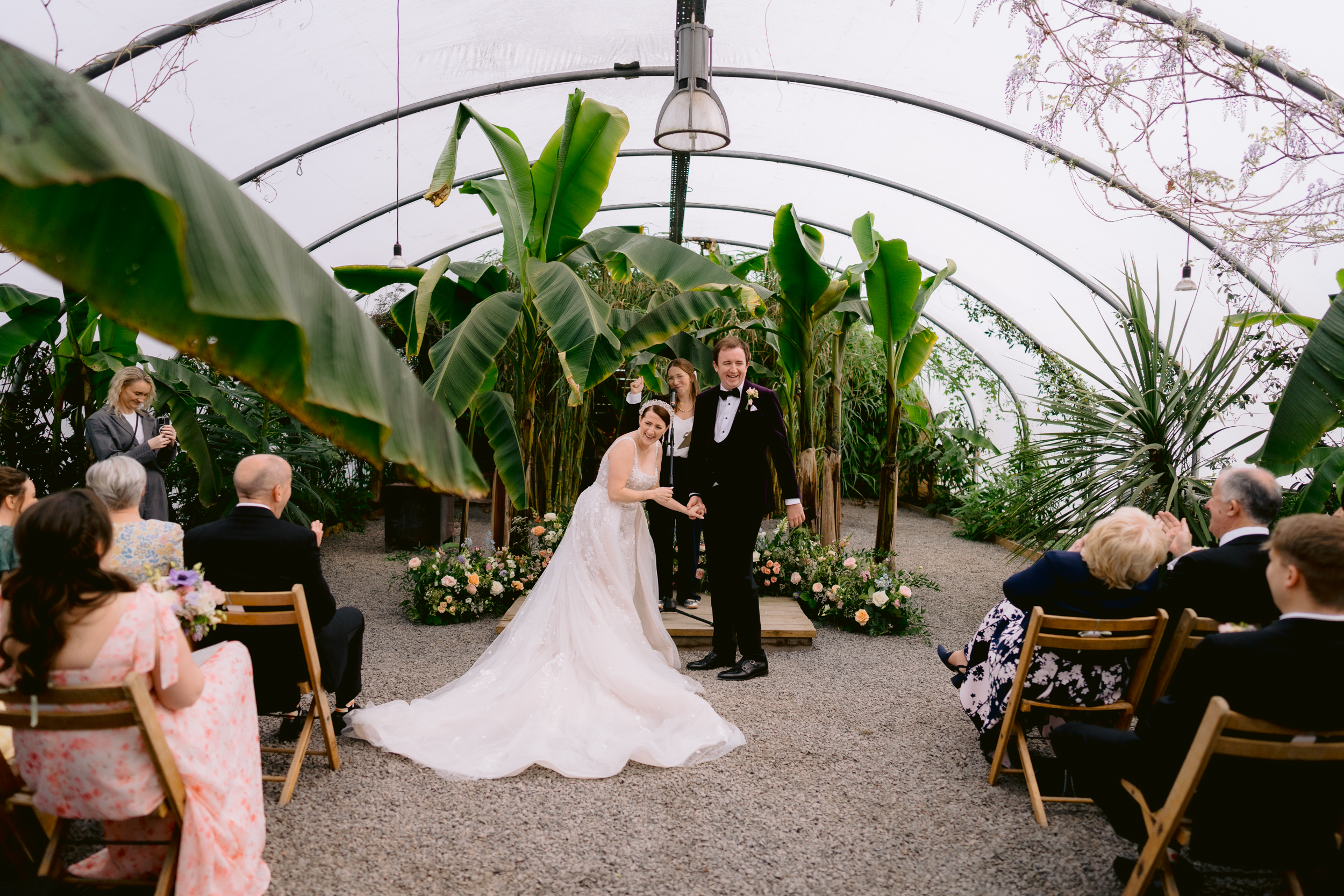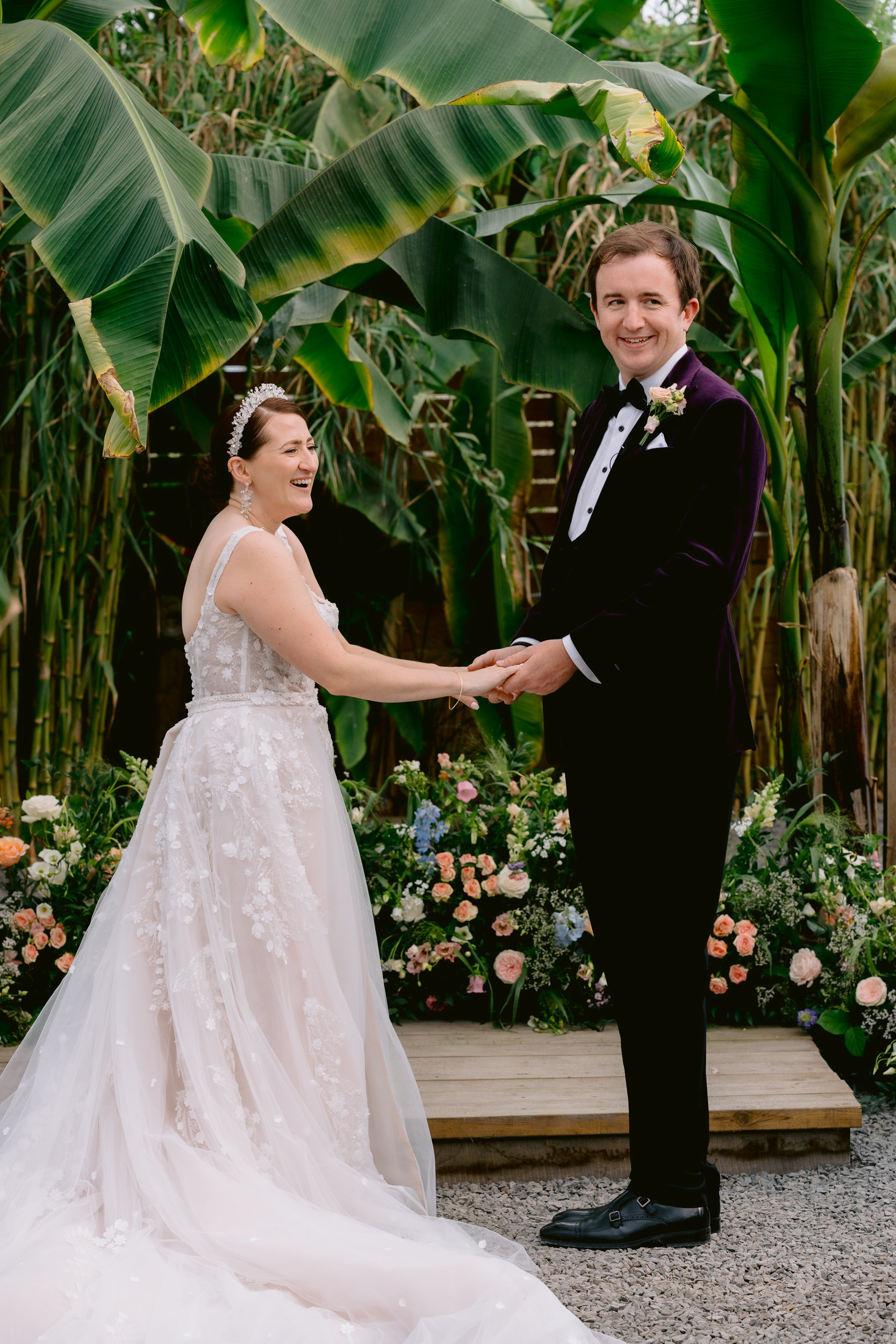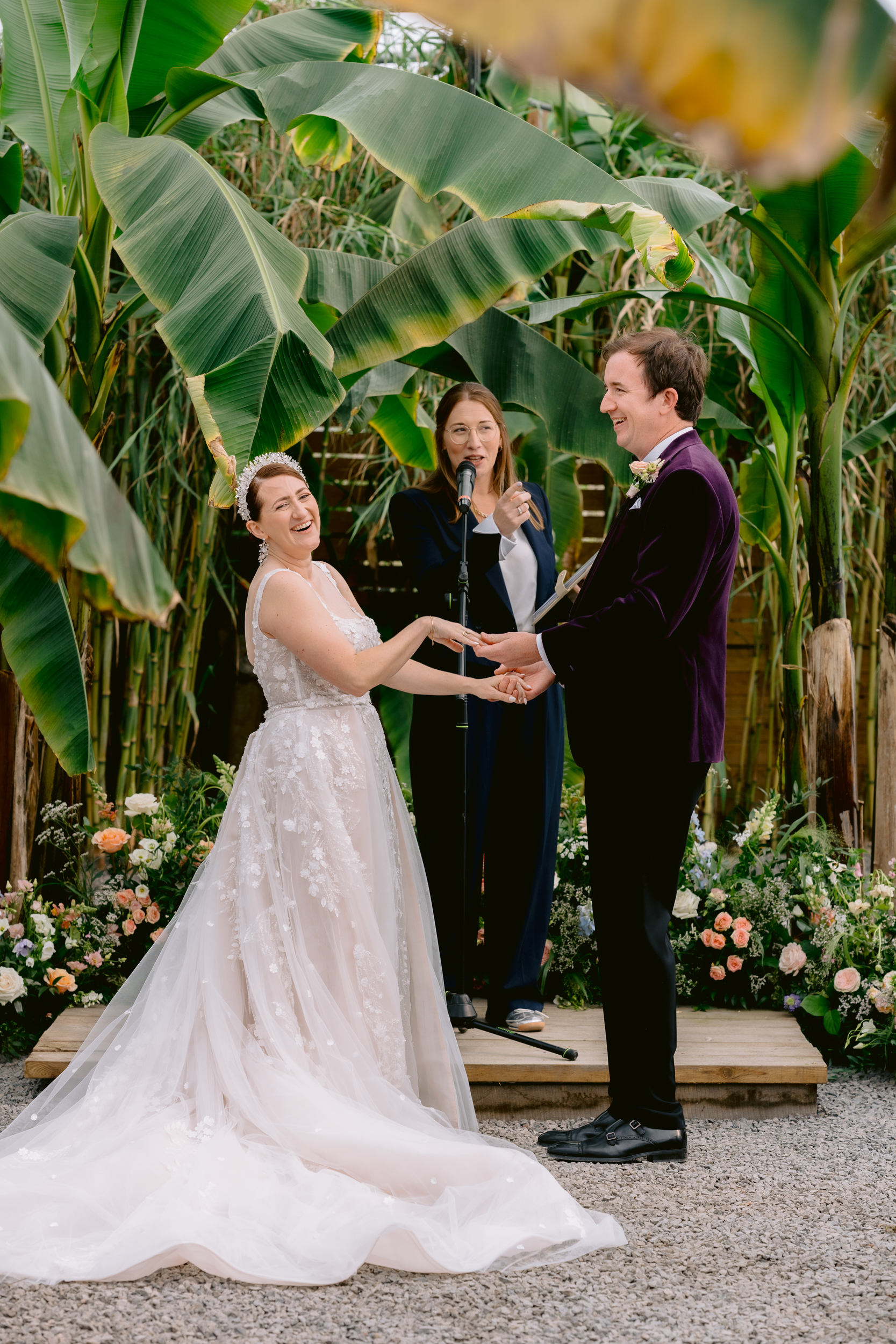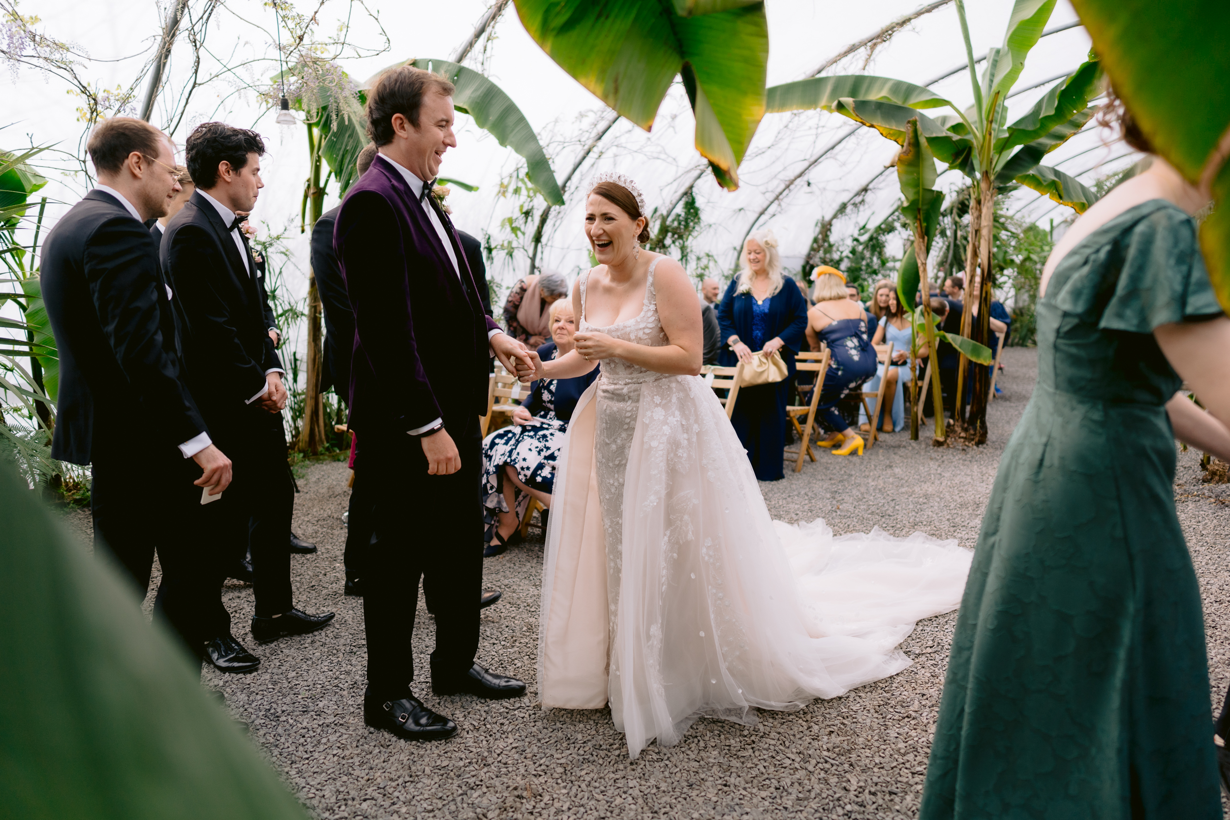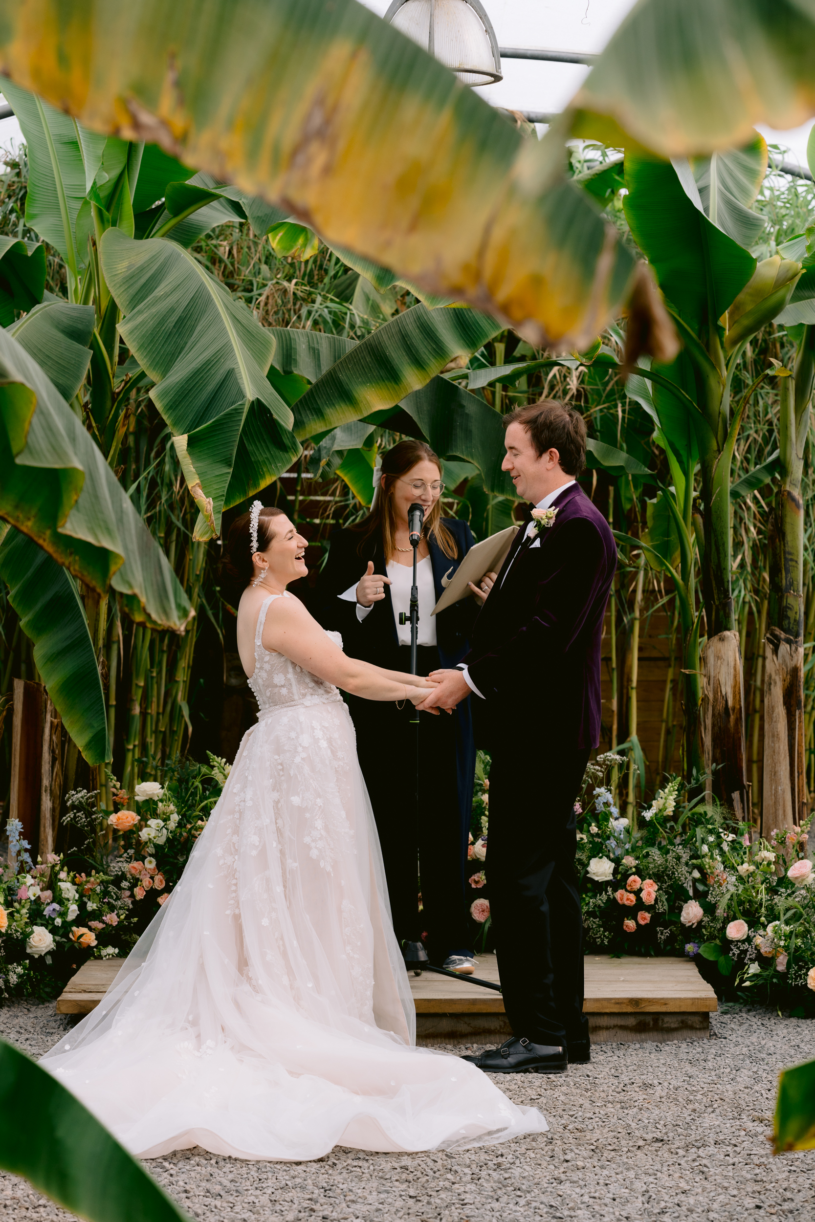 The ceremony was humorously led by celebrant Olivia Coleman, in a greenhouse filled with ponds, plants and lovely guests cheering on the happy couple.