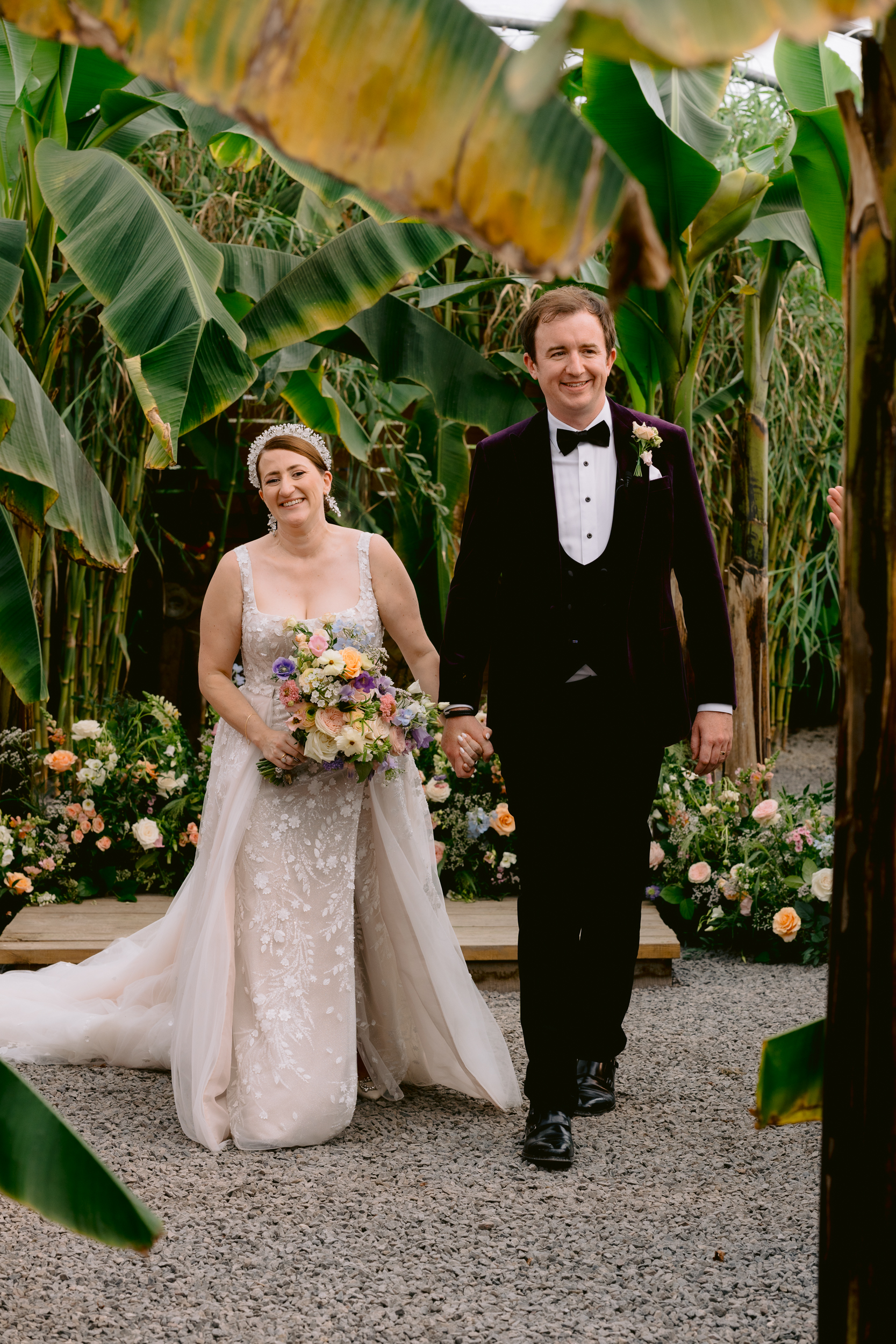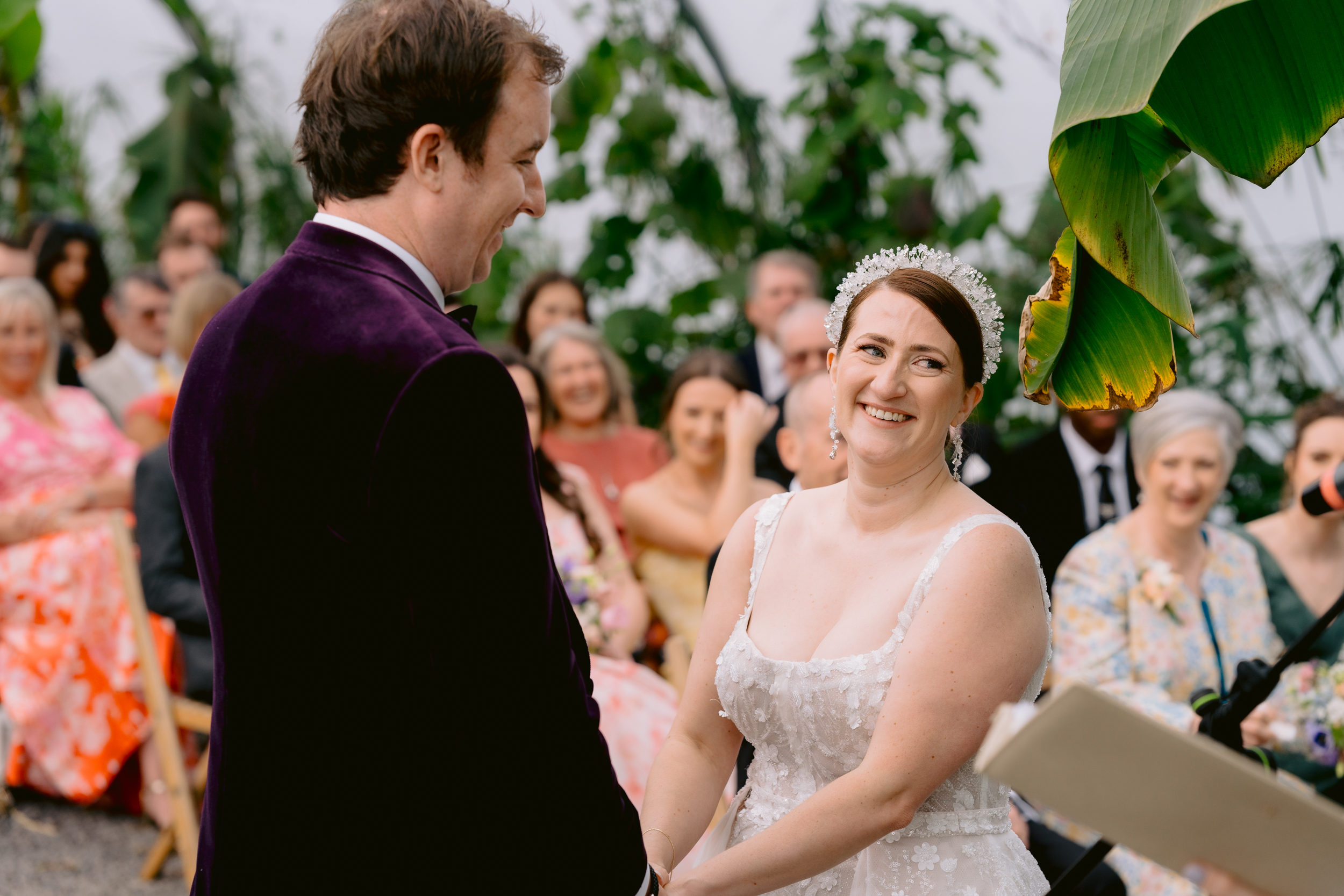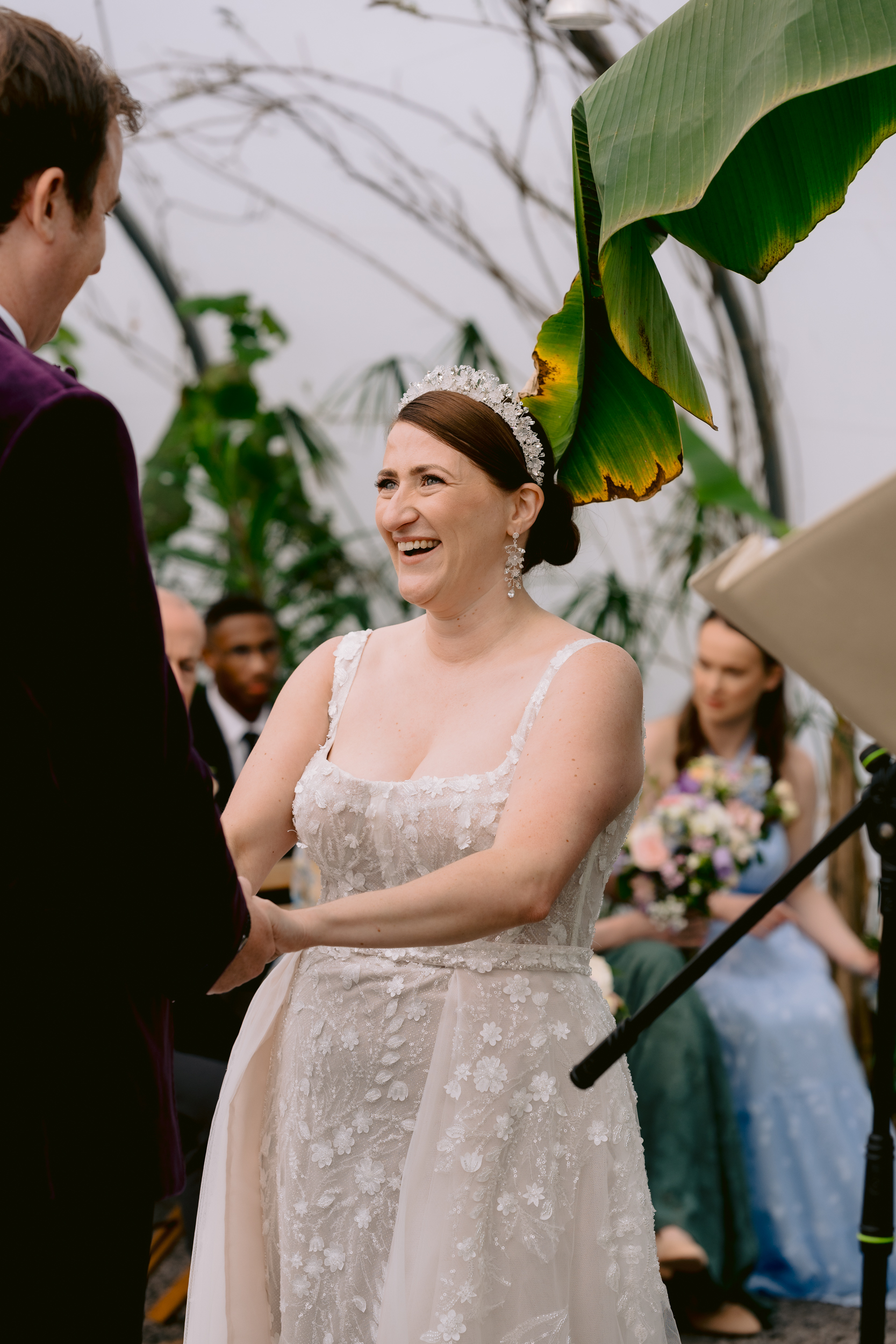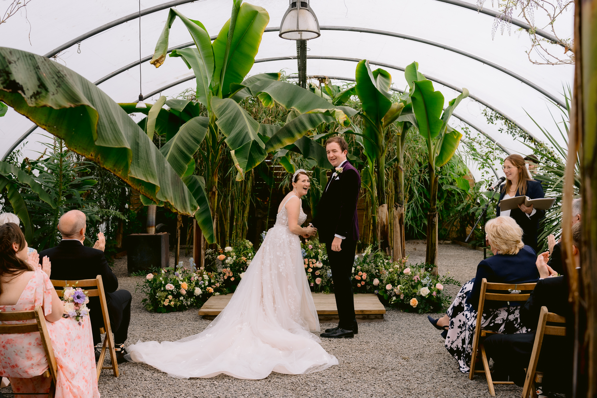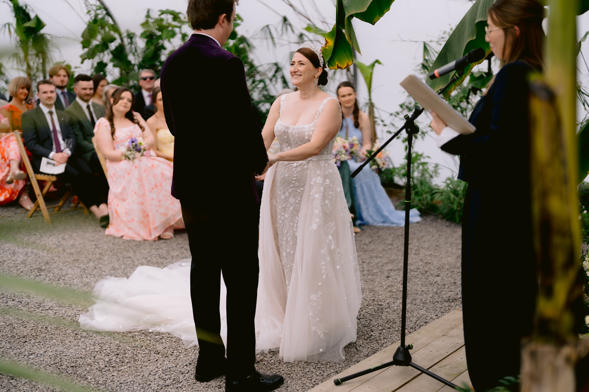 The ceremony was humorously led by celebrant Olivia Coleman, in a greenhouse filled with ponds, plants and lovely guests cheering on the happy couple.