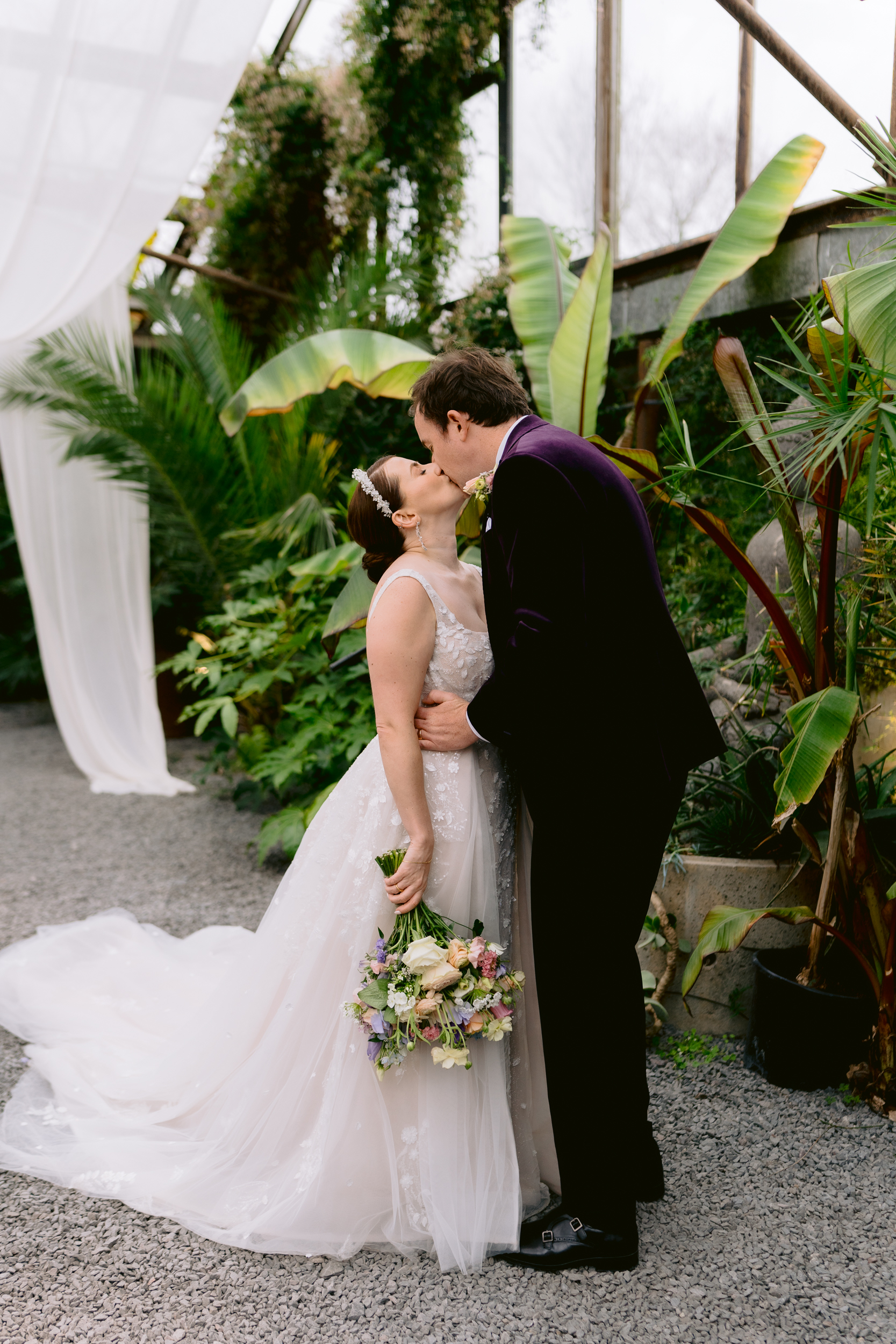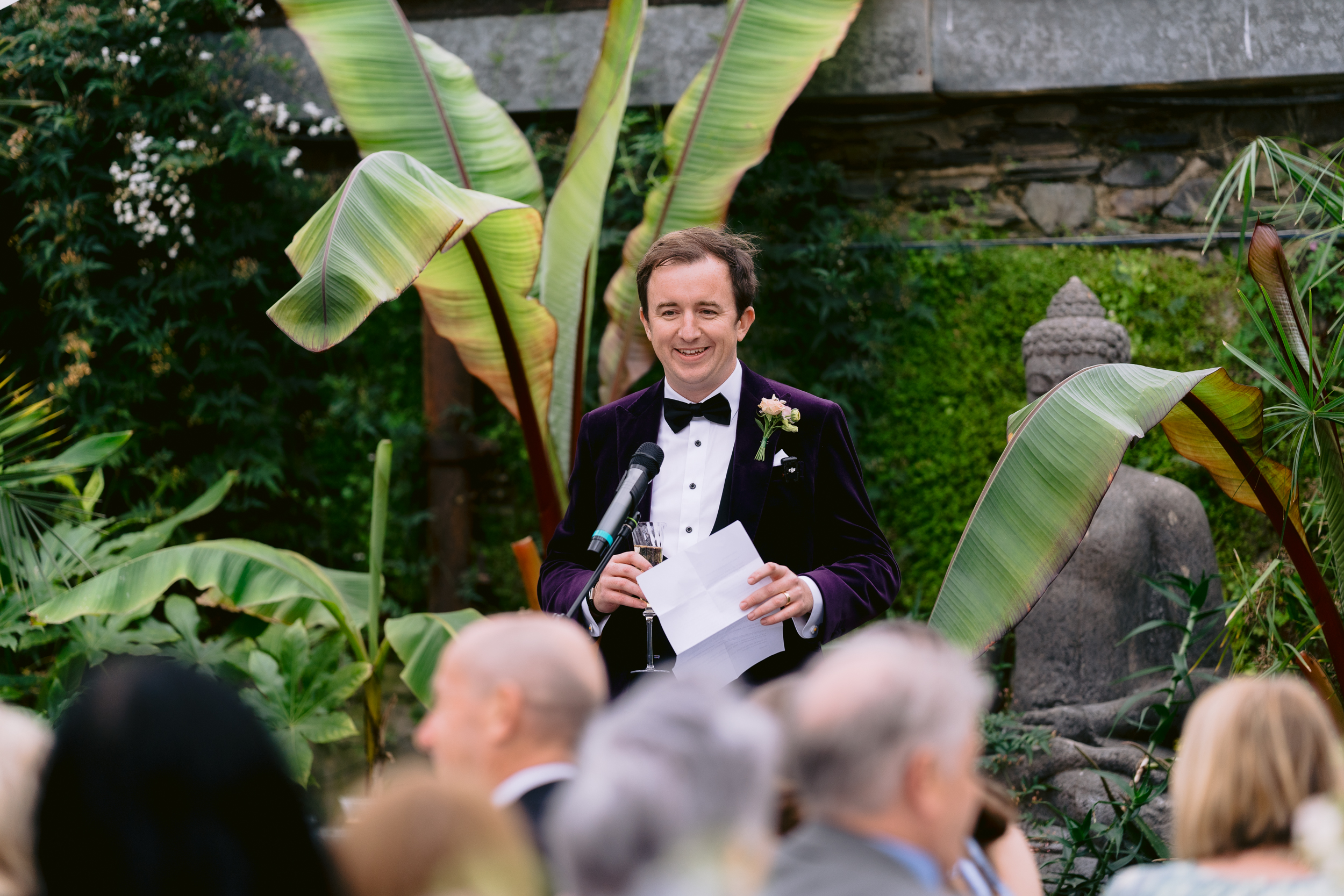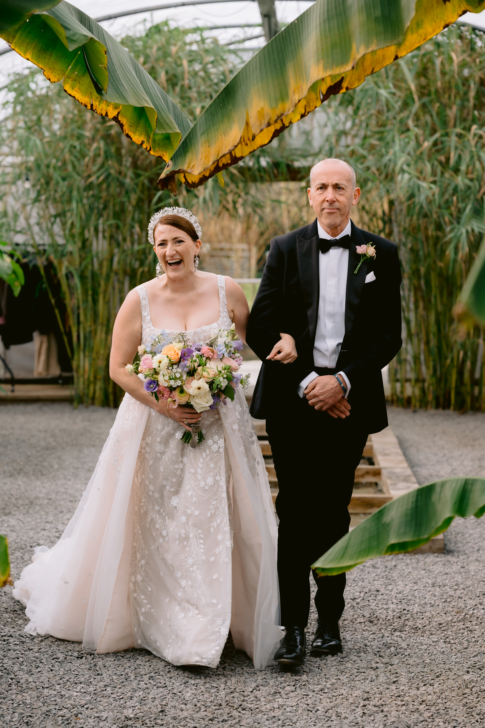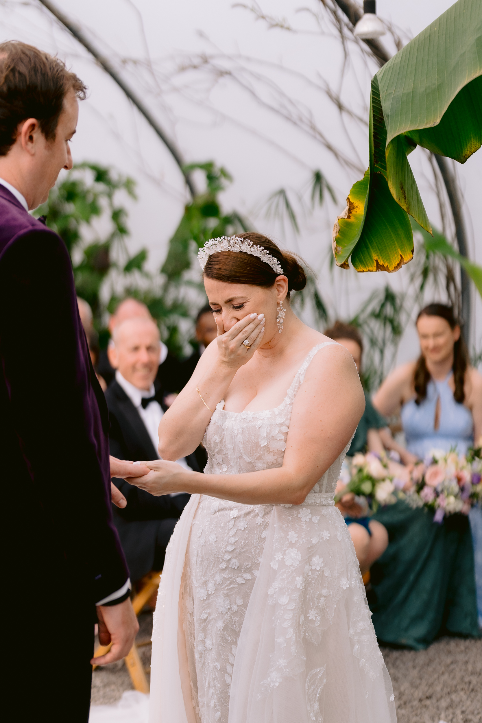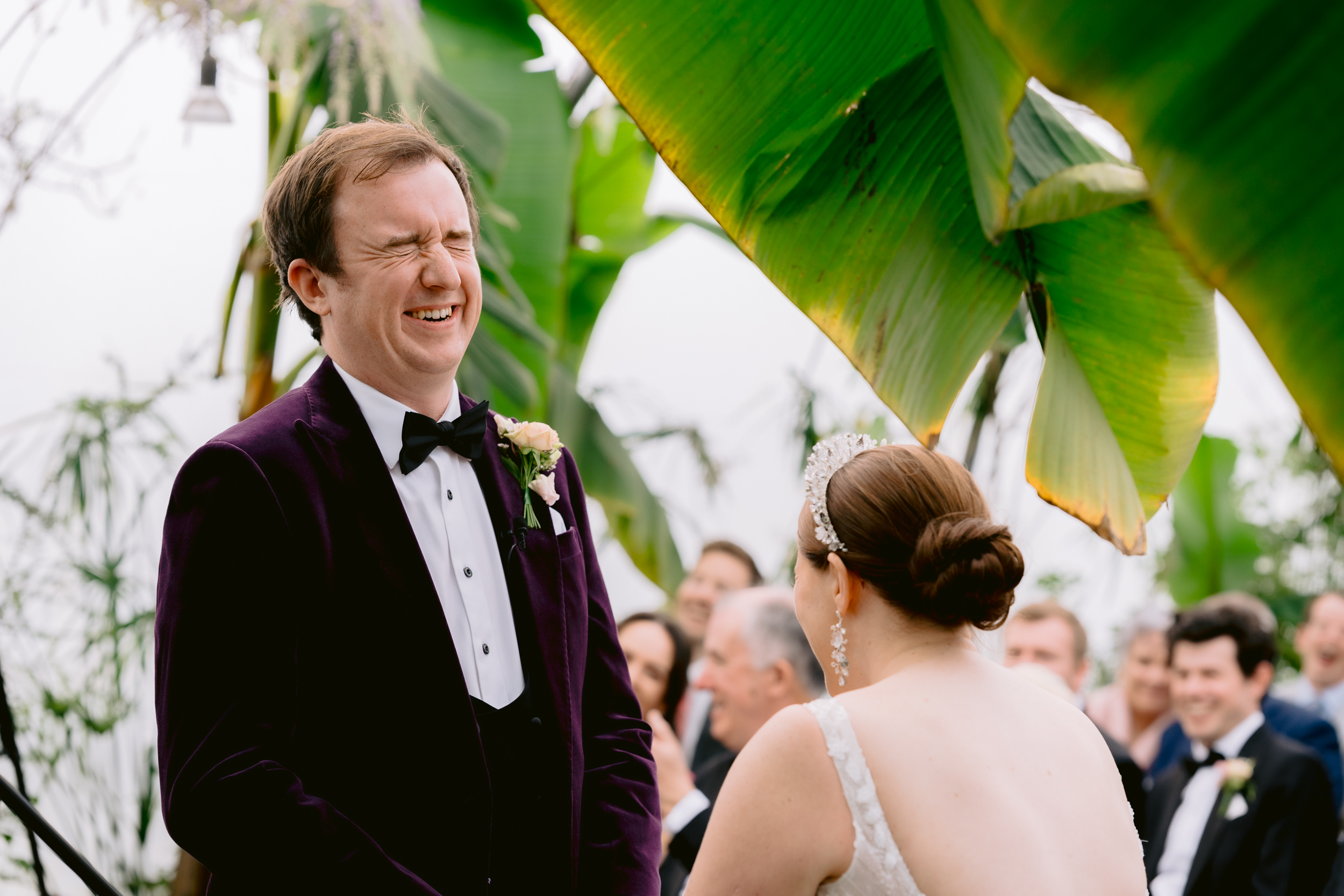 The ceremony was humorously led by celebrant Olivia Coleman, in a greenhouse filled with ponds, plants and lovely guests cheering on the happy couple.