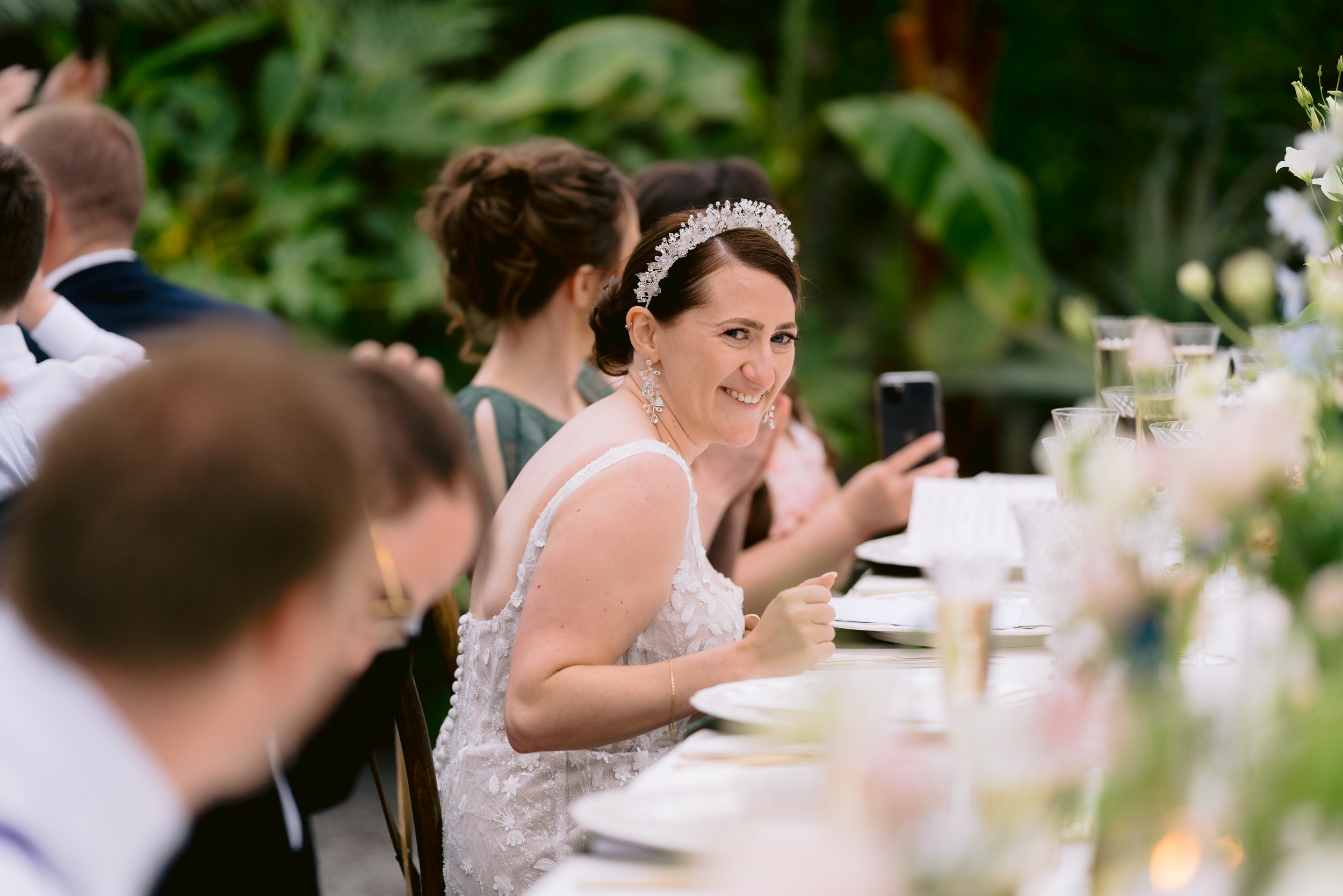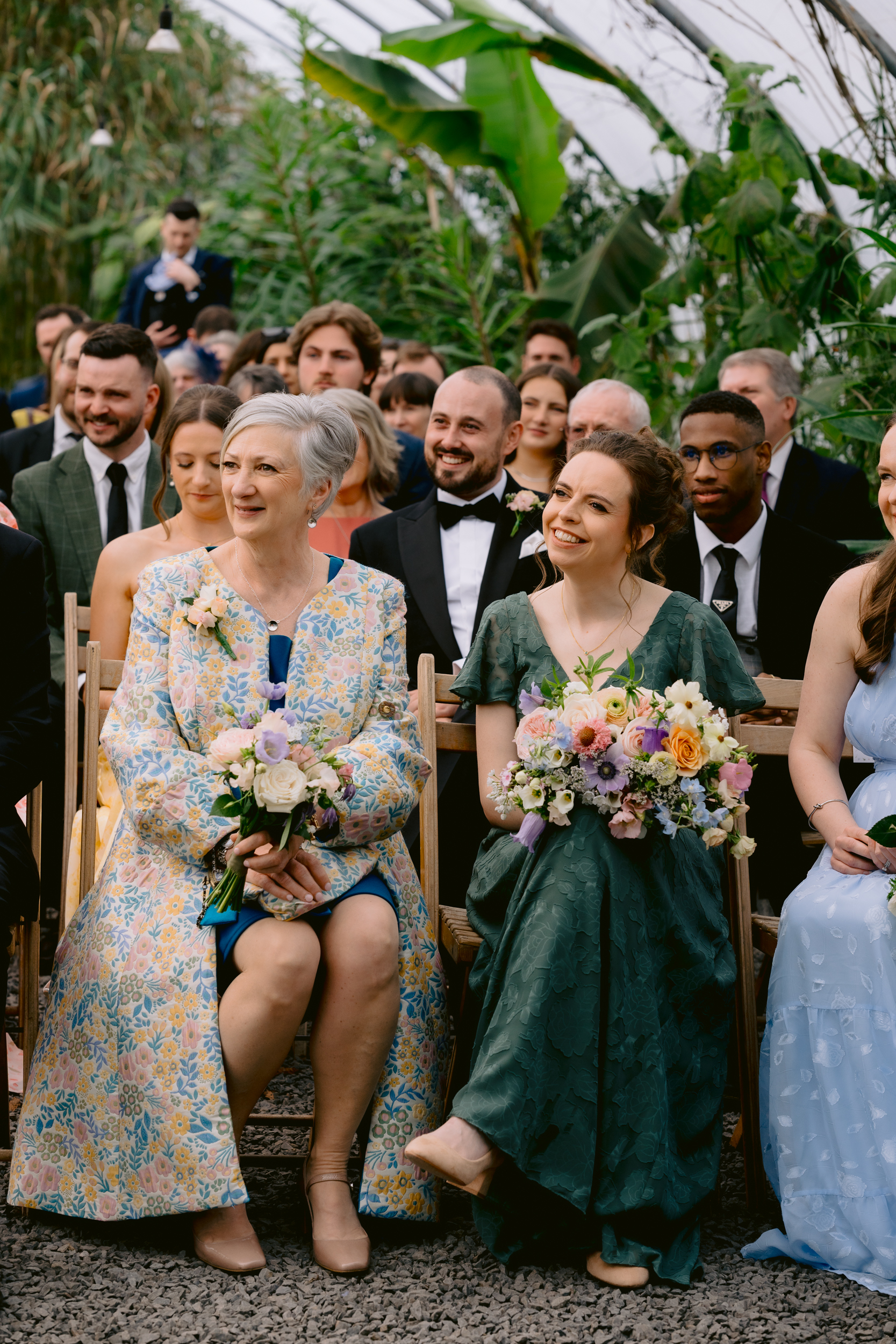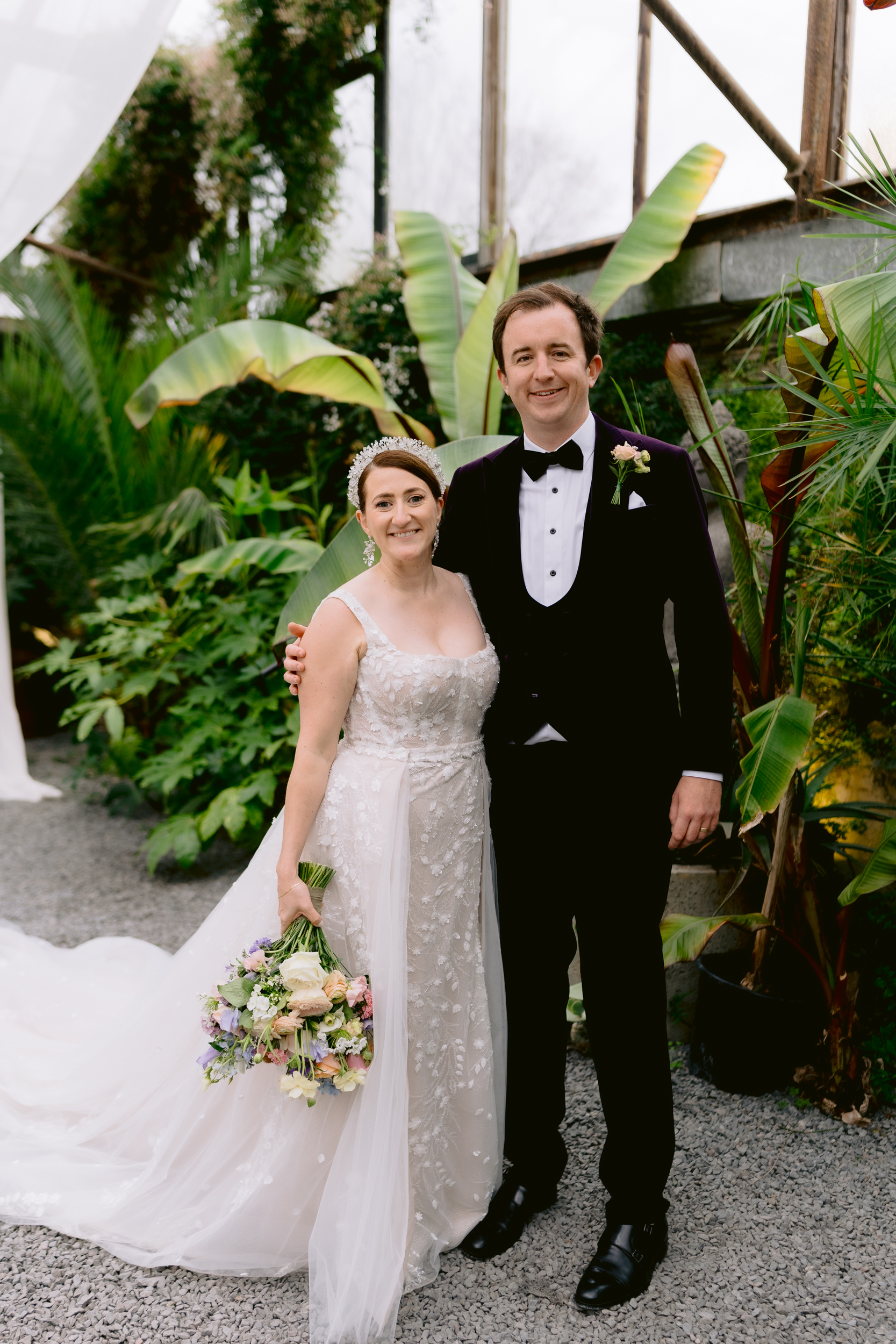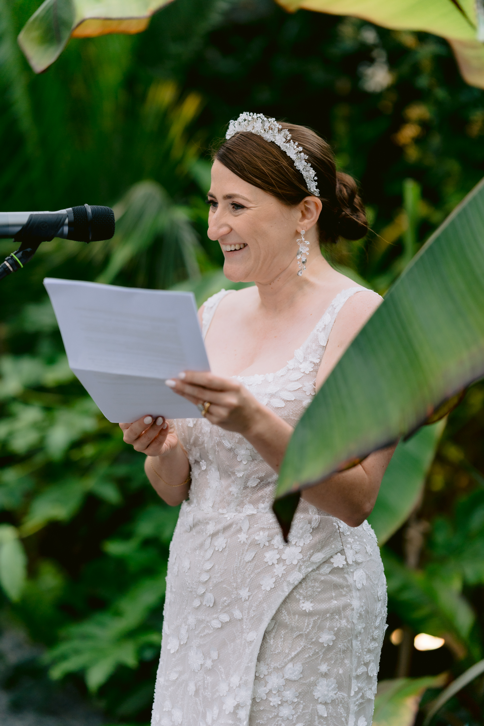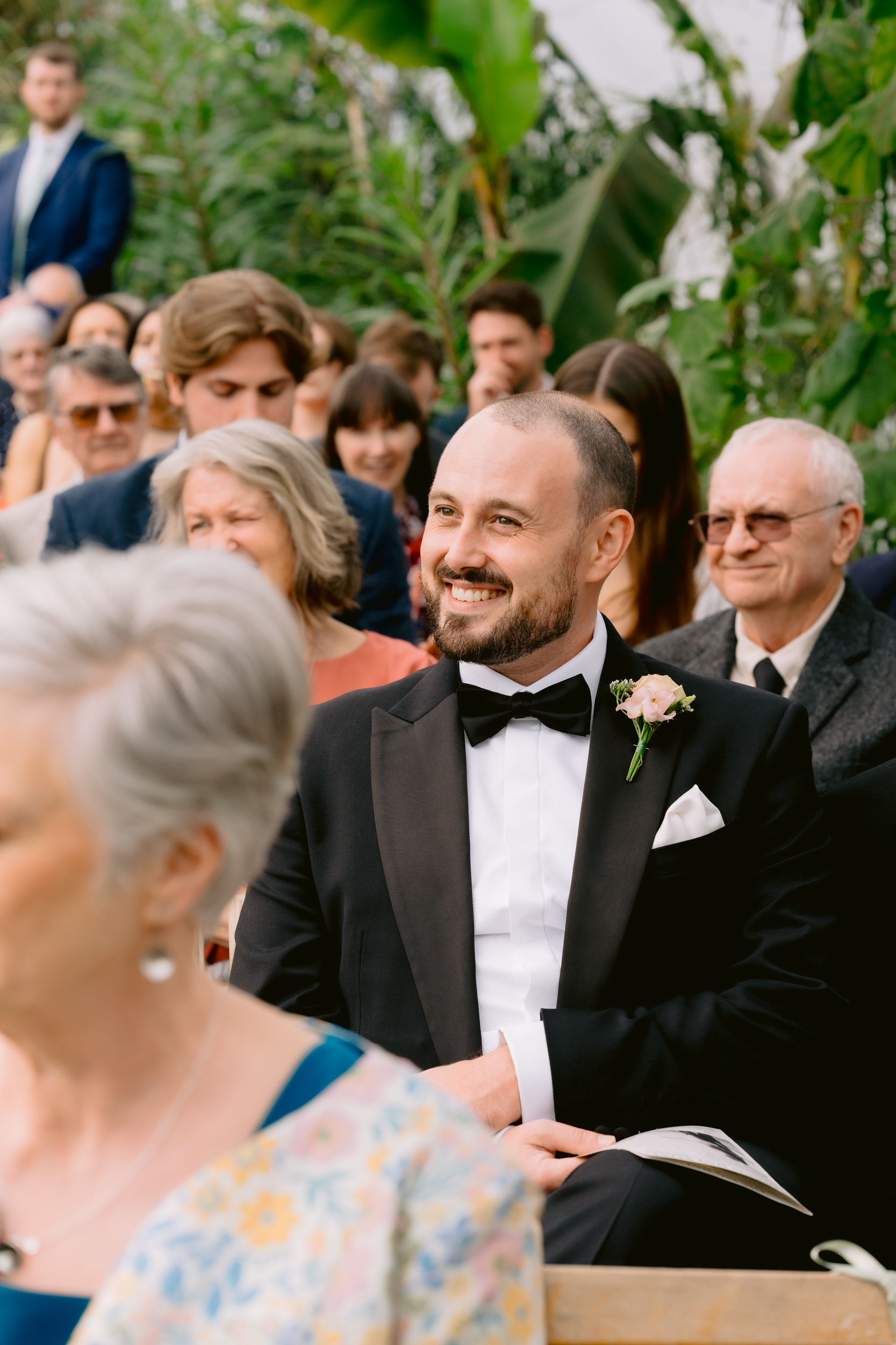 The ceremony was humorously led by celebrant Olivia Coleman, in a greenhouse filled with ponds, plants and lovely guests cheering on the happy couple.