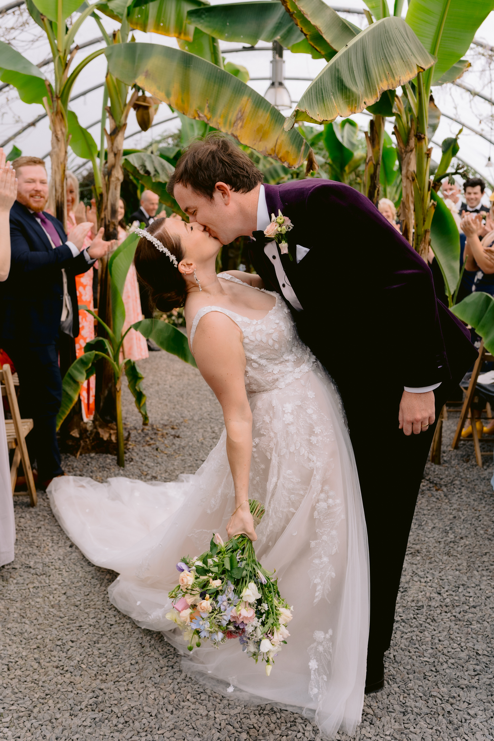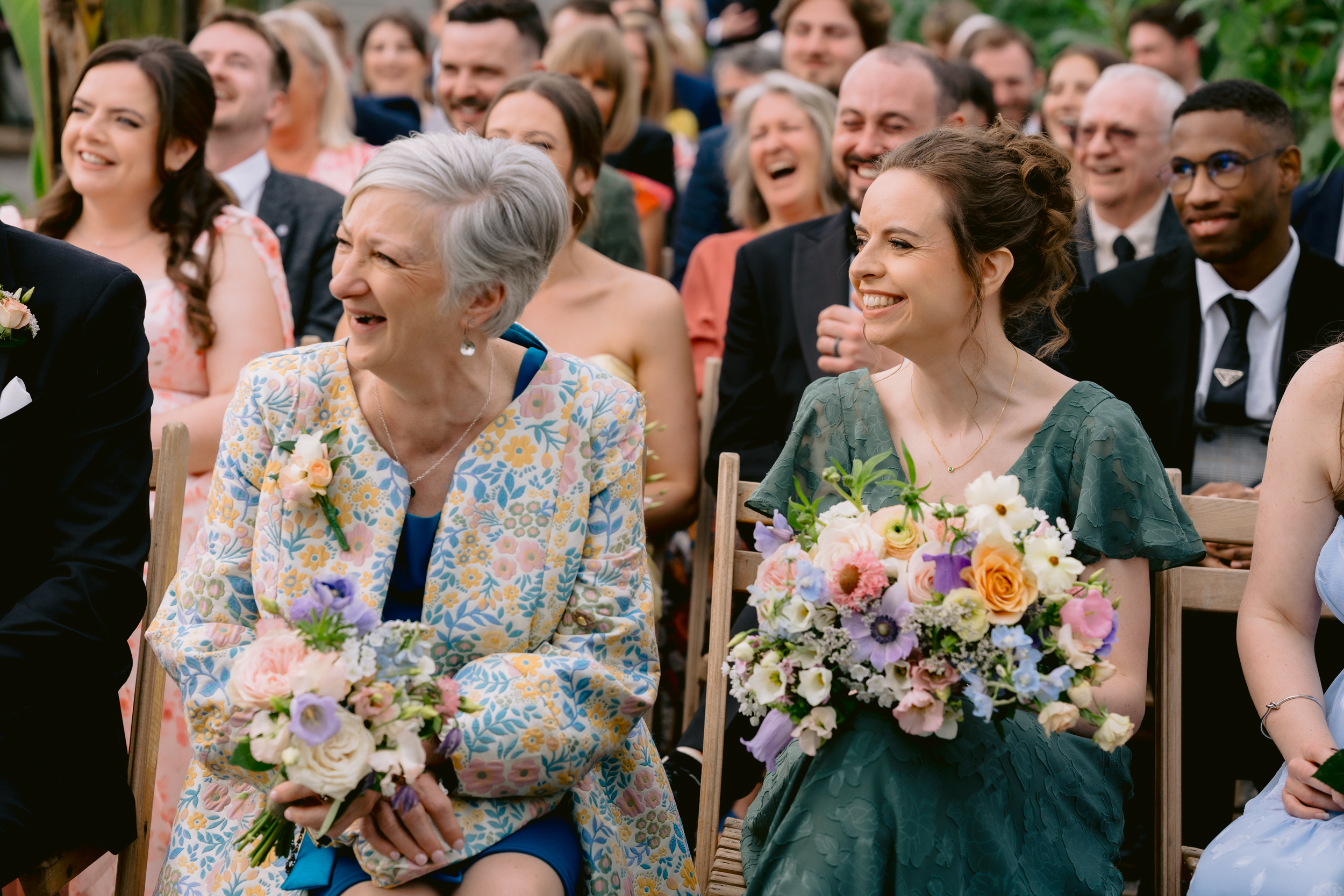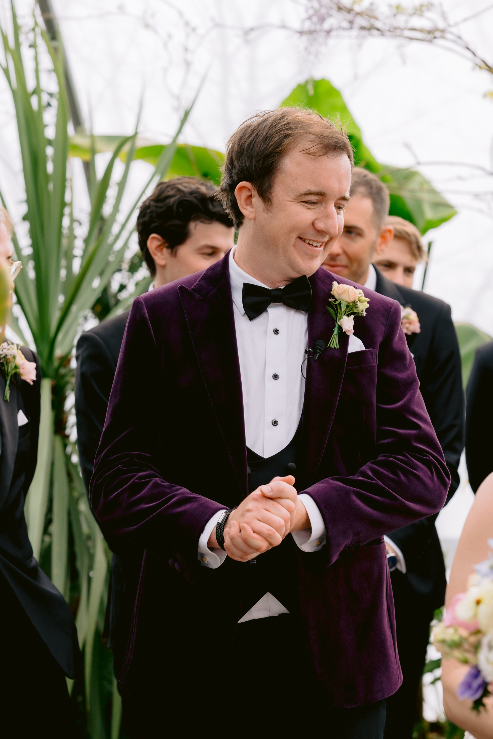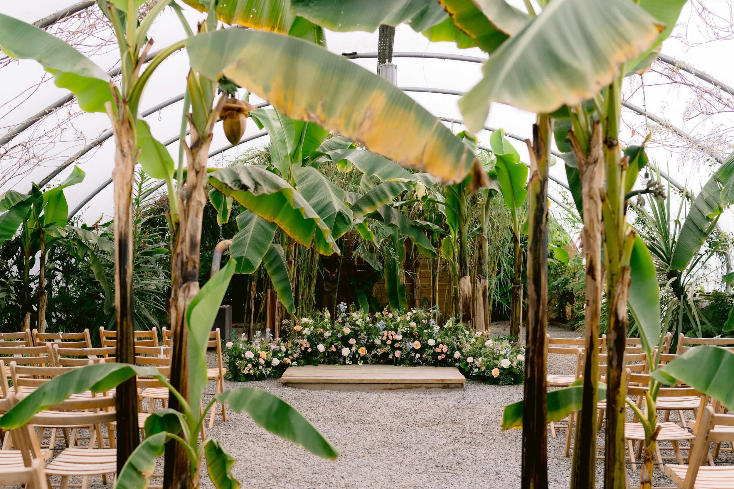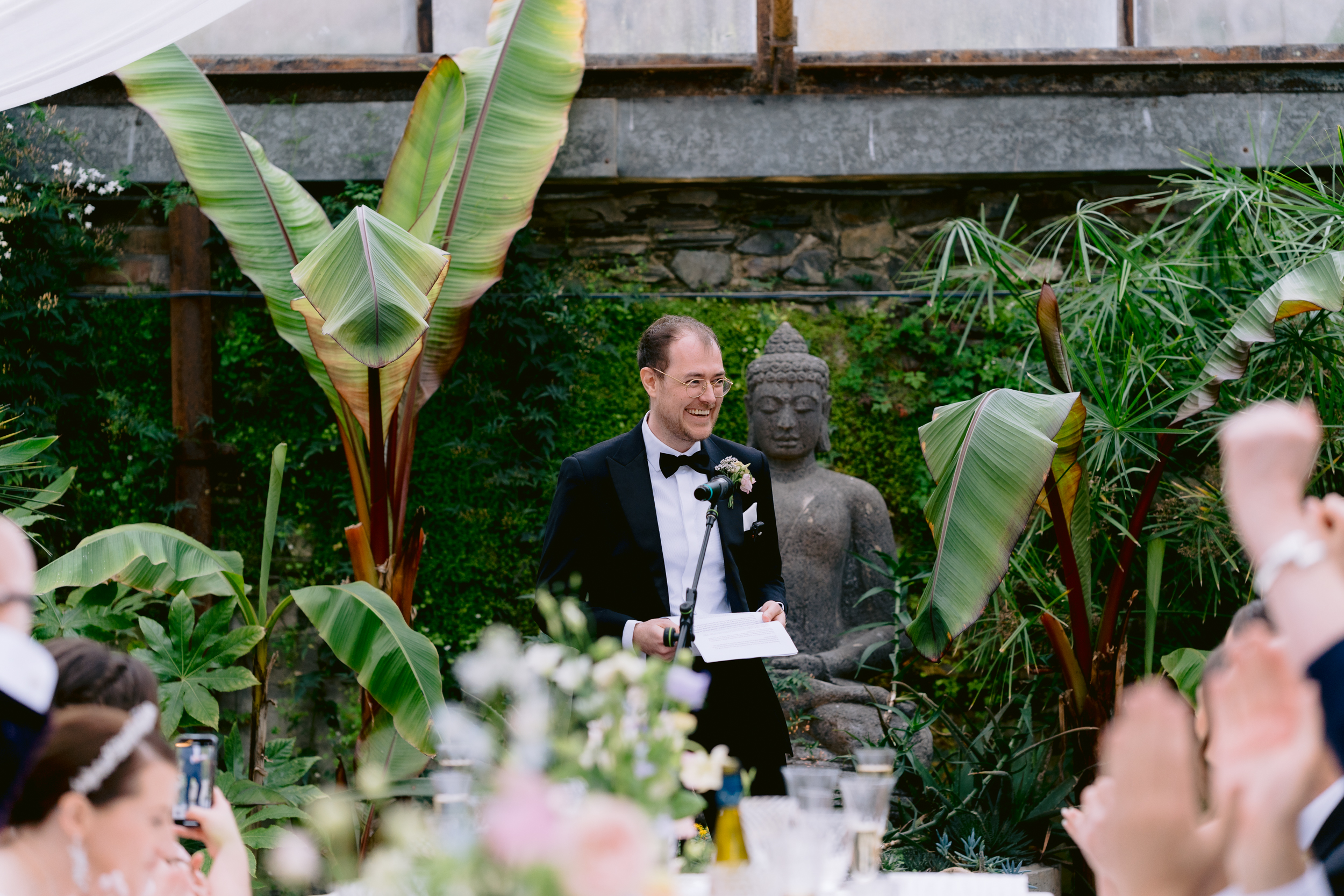 The ceremony was humorously led by celebrant Olivia Coleman, in a greenhouse filled with ponds, plants and lovely guests cheering on the happy couple.