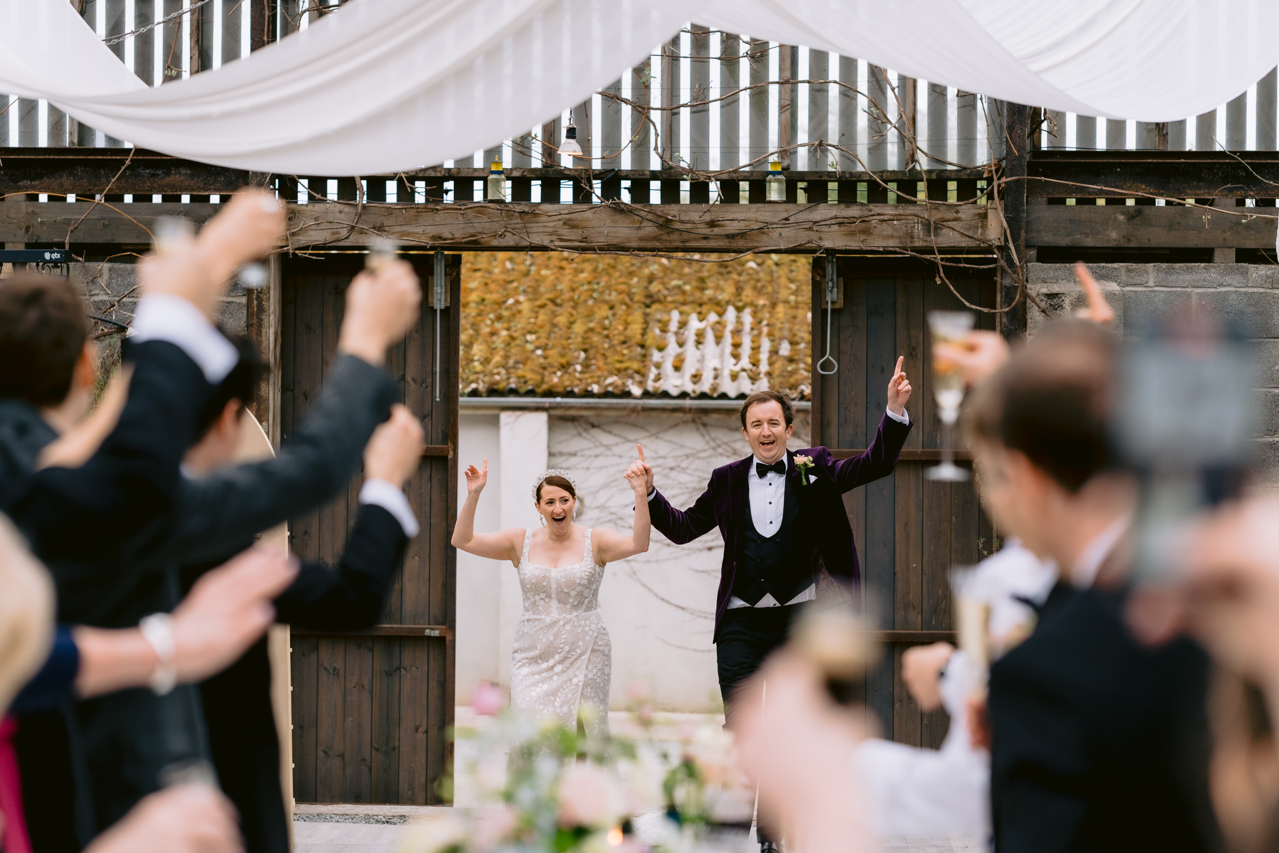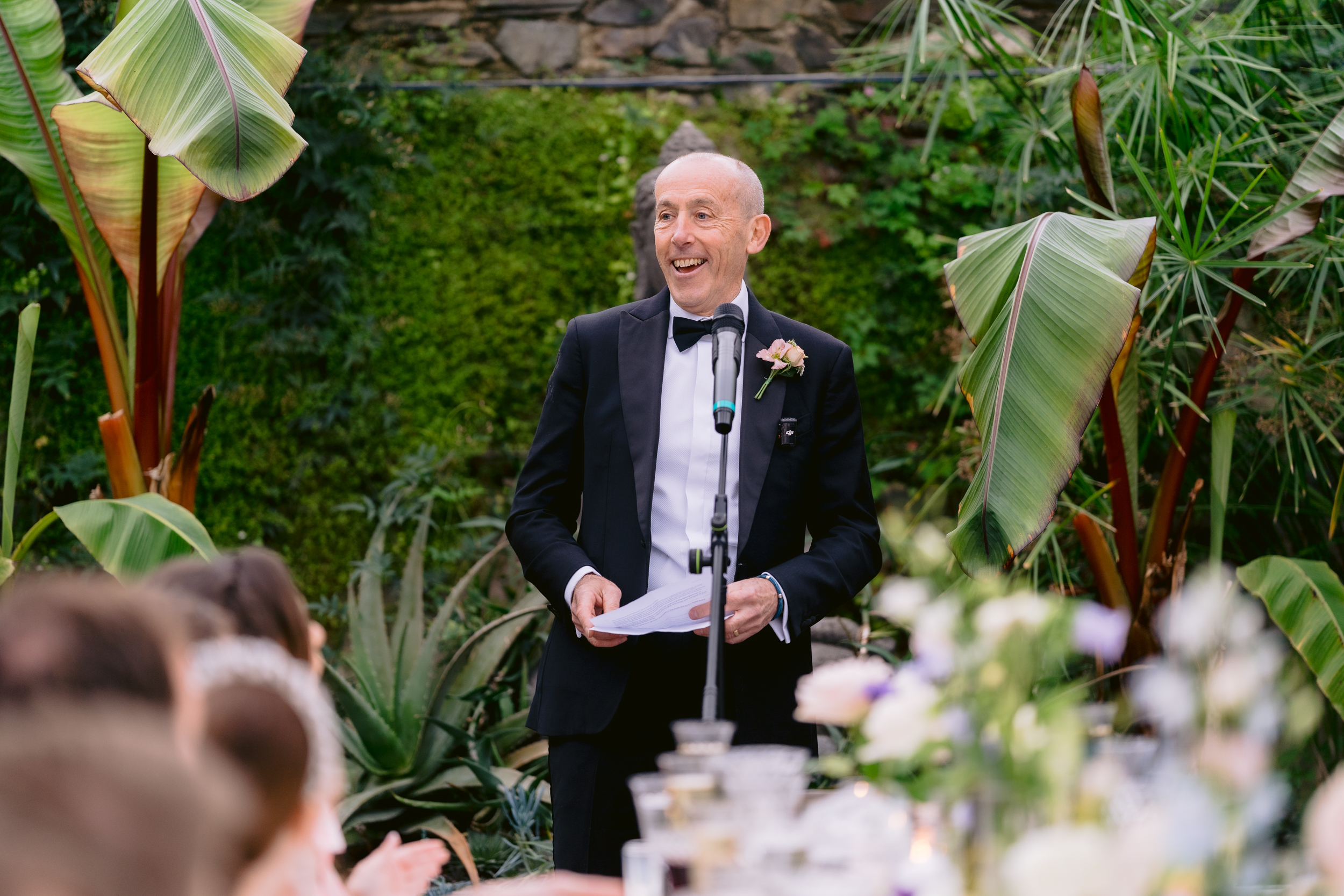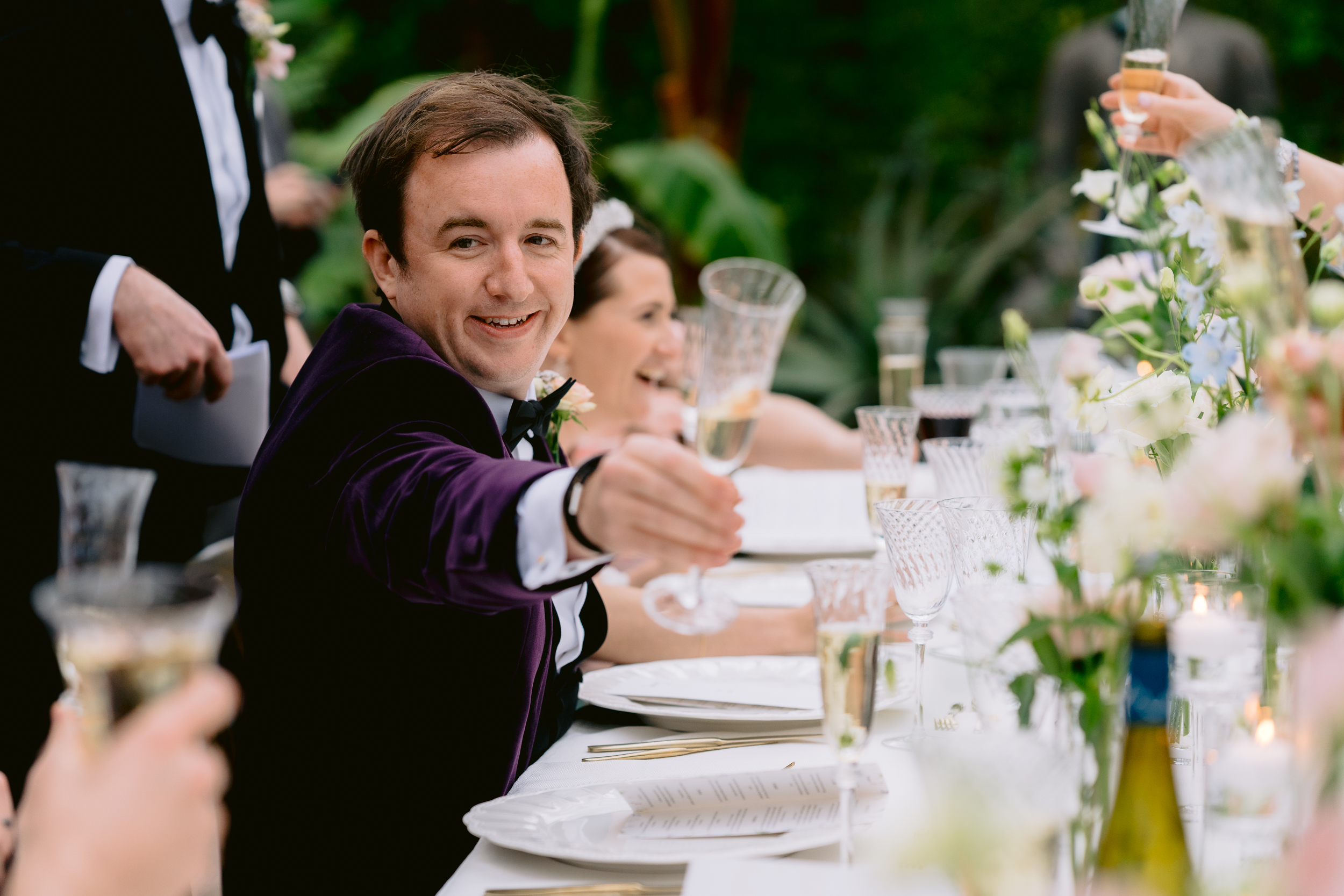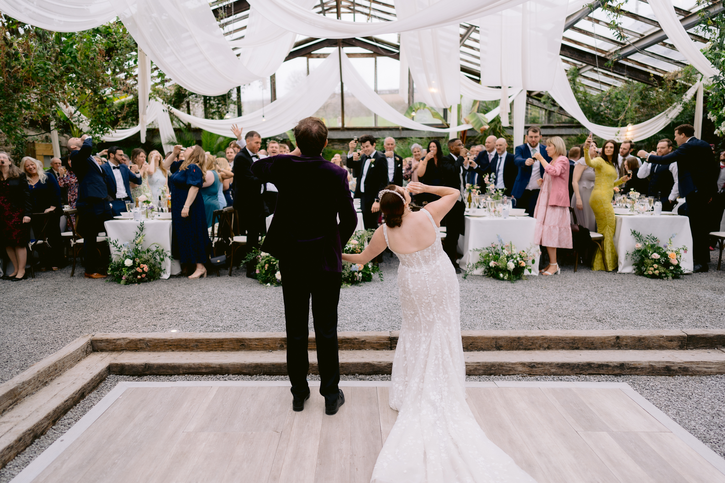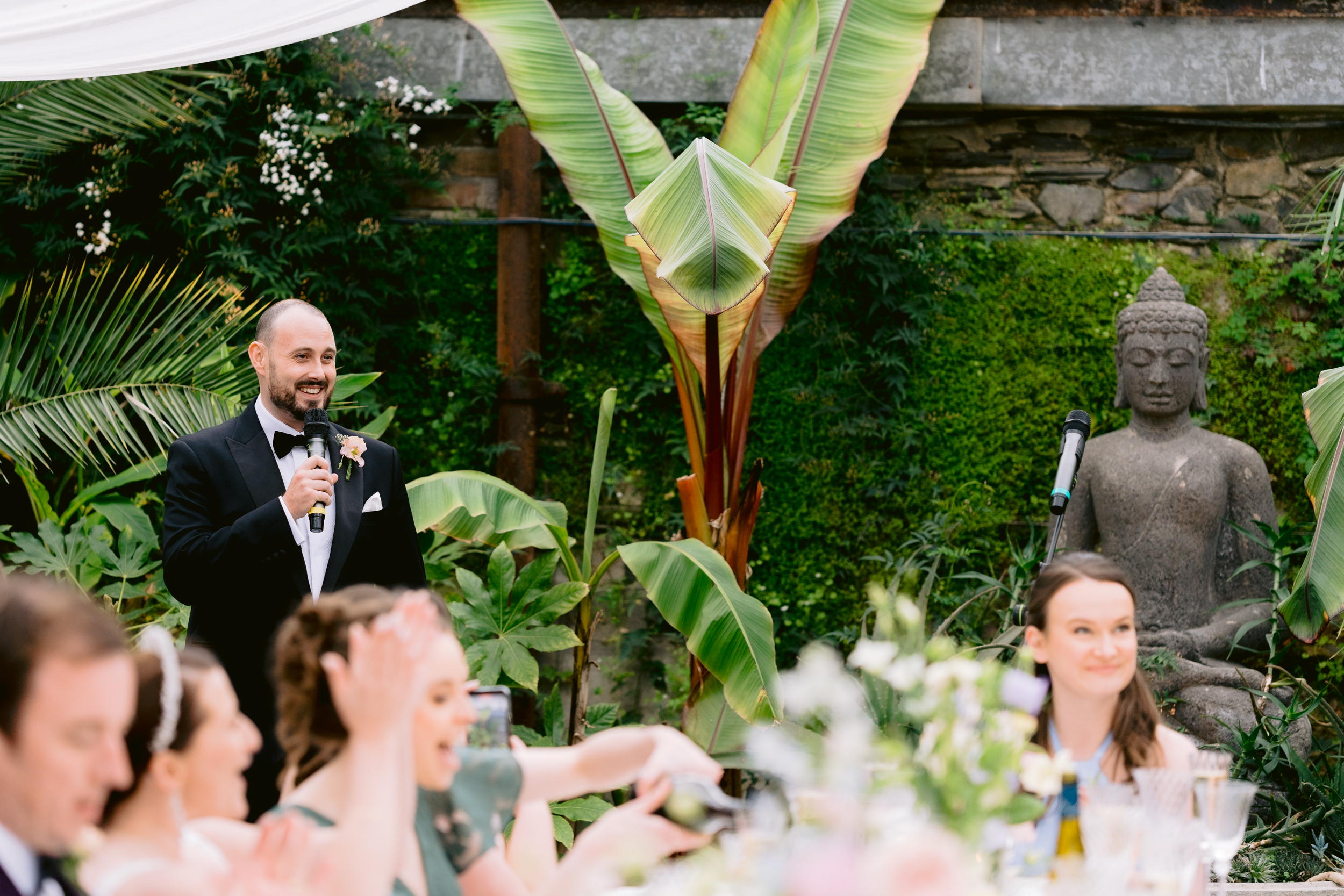 The ceremony was humorously led by celebrant Olivia Coleman, in a greenhouse filled with ponds, plants and lovely guests cheering on the happy couple.