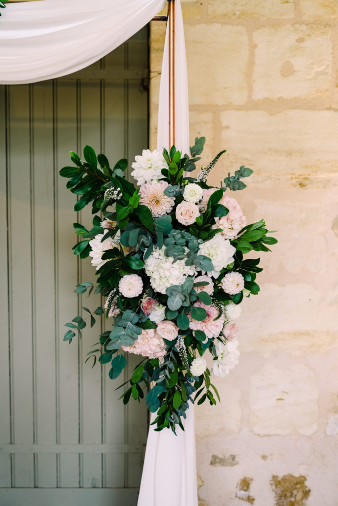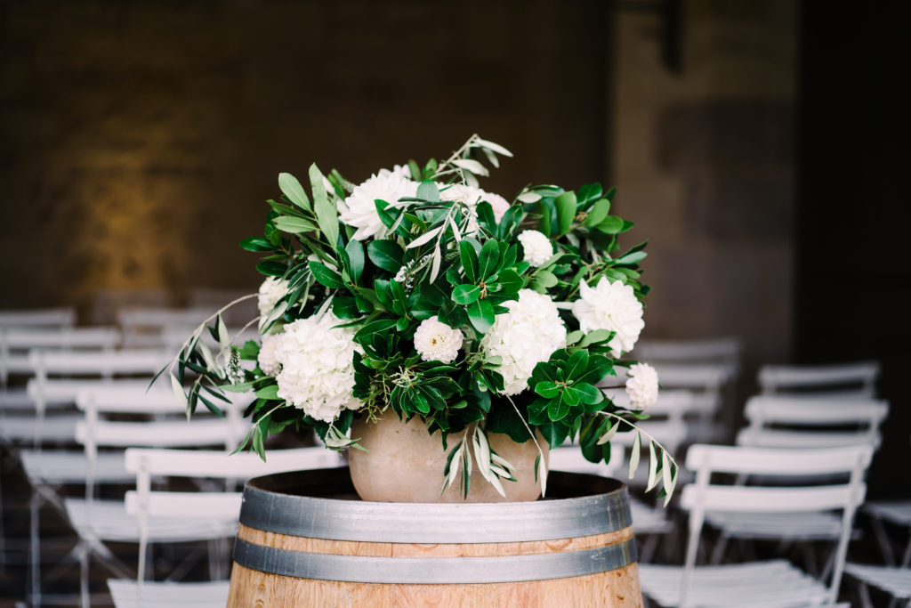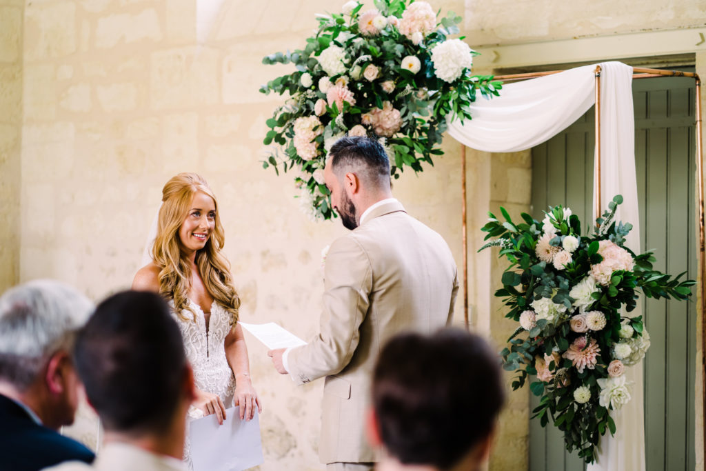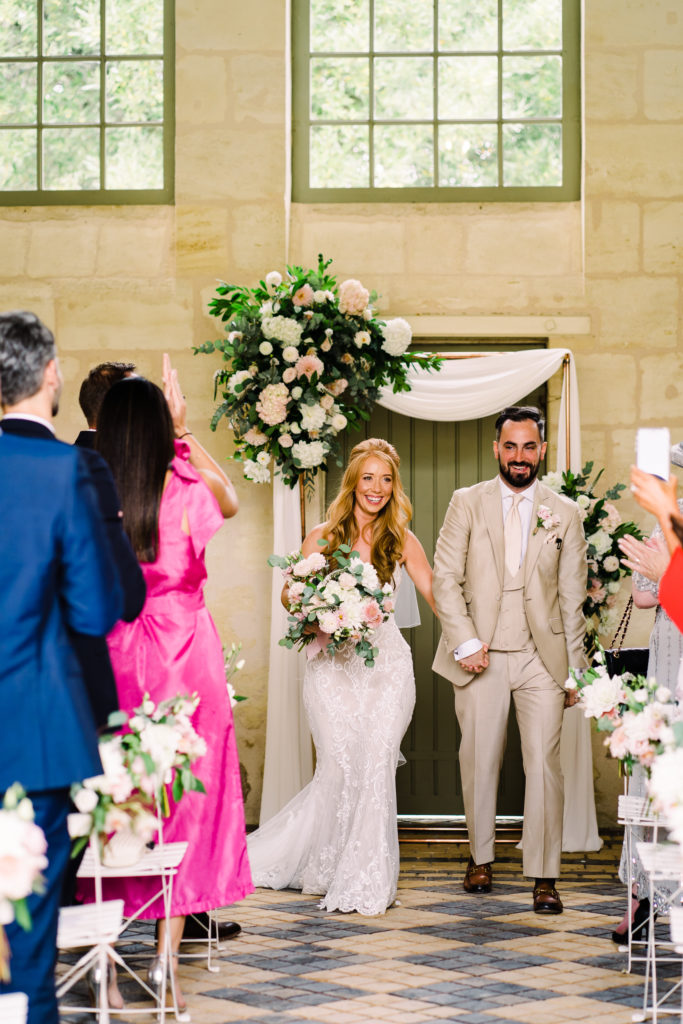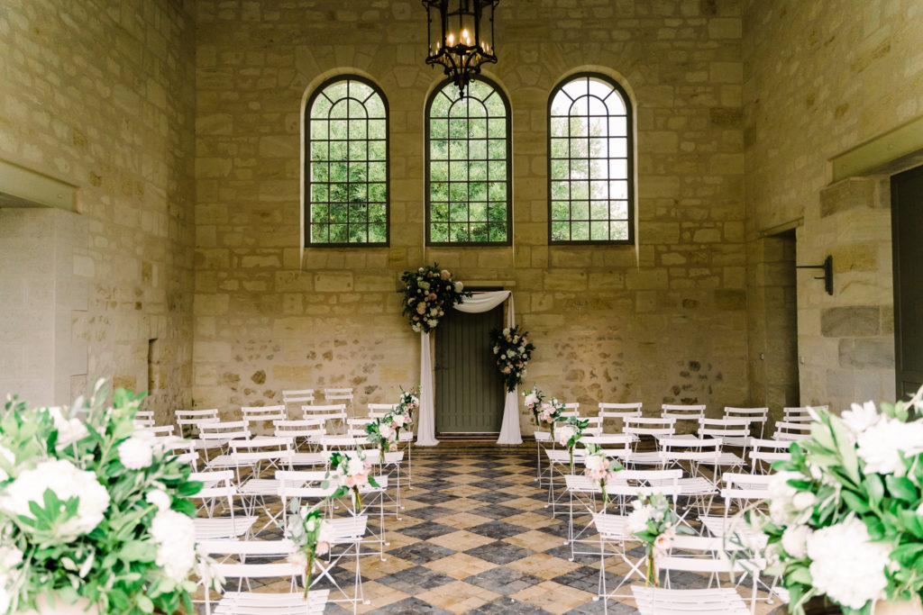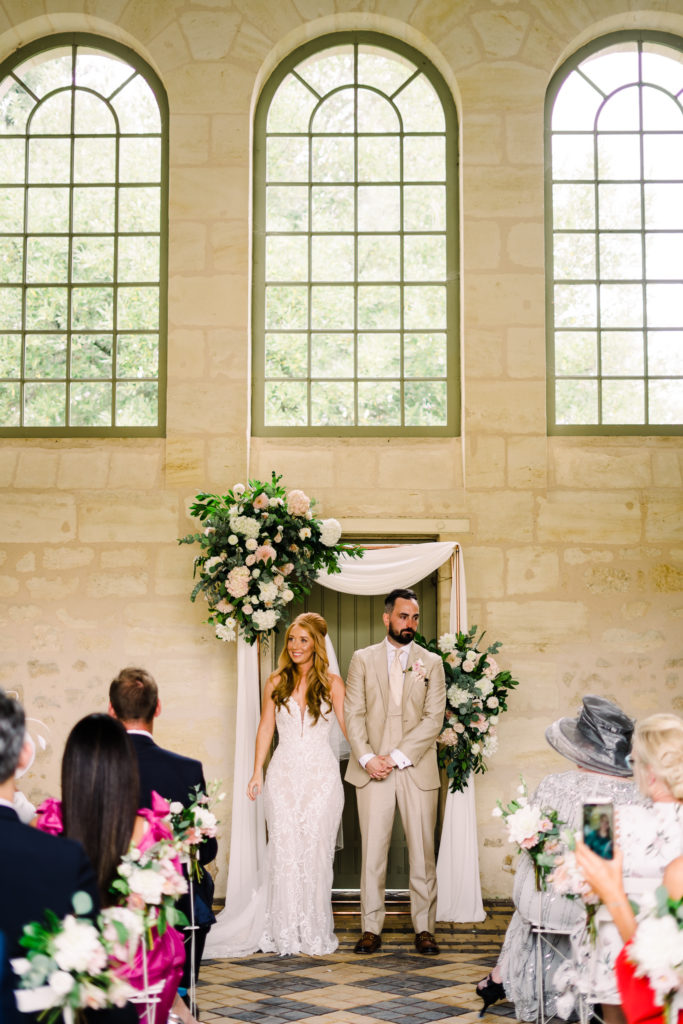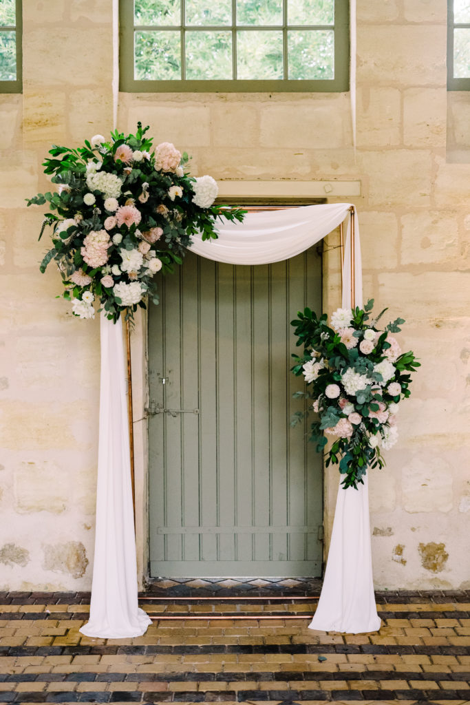 The chateau on its own is an incredible backdrop. But the details elevated the venues aesthetic even further. My favourite part of the ceremony set-up is the simple backdrop. A copper frame, with elegant draping and asymmetrical floral design. The stunning flower arrangements are the handiwork of Pauline from Atelier Septembre. I also loved the nod to the location using name place holders. Bordeaux is known for its wine. Hence why using the corks is a lovely touch.