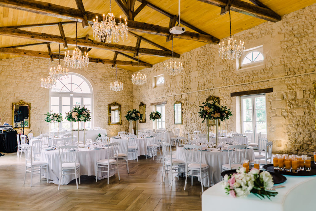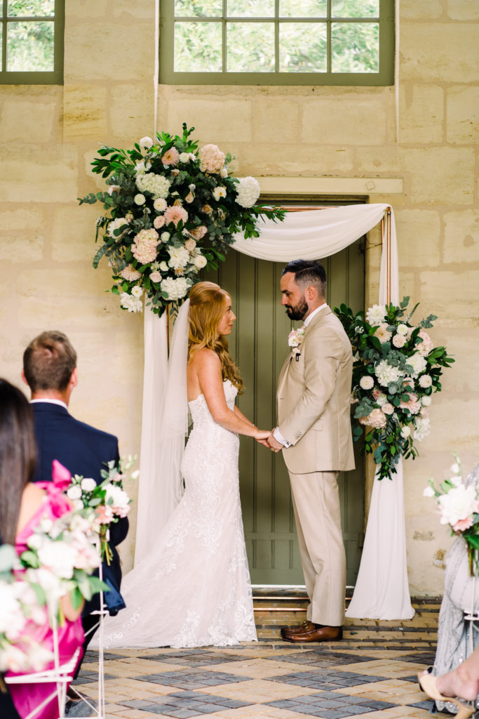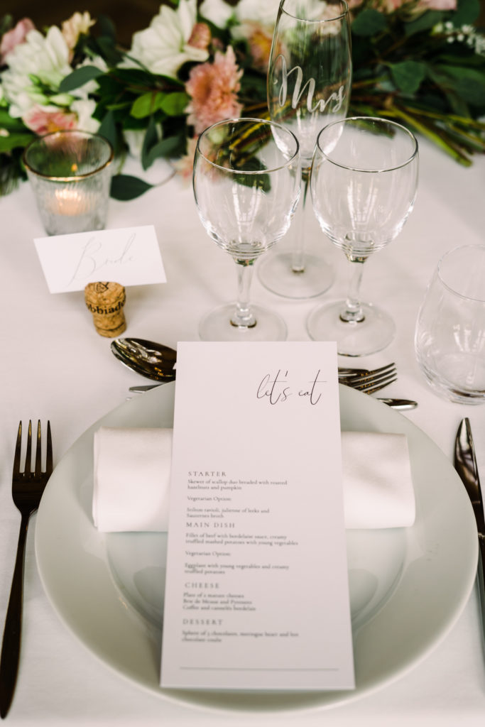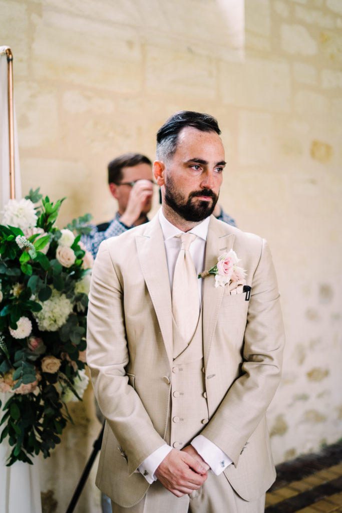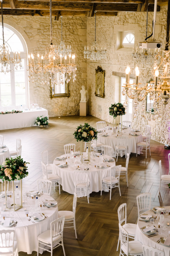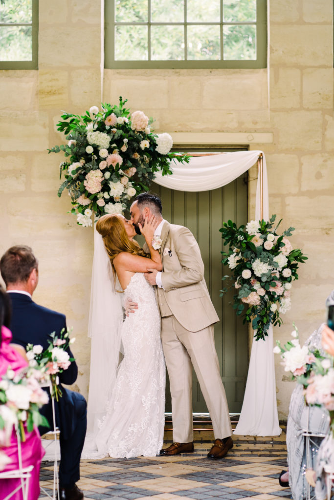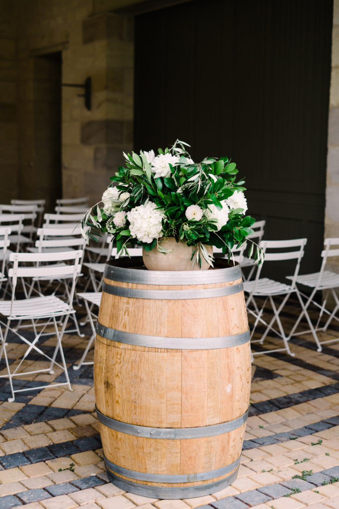 The chateau on its own is an incredible backdrop. But the details elevated the venues aesthetic even further. My favourite part of the ceremony set-up is the simple backdrop. A copper frame, with elegant draping and asymmetrical floral design. The stunning flower arrangements are the handiwork of Pauline from Atelier Septembre. I also loved the nod to the location using name place holders. Bordeaux is known for its wine. Hence why using the corks is a lovely touch.