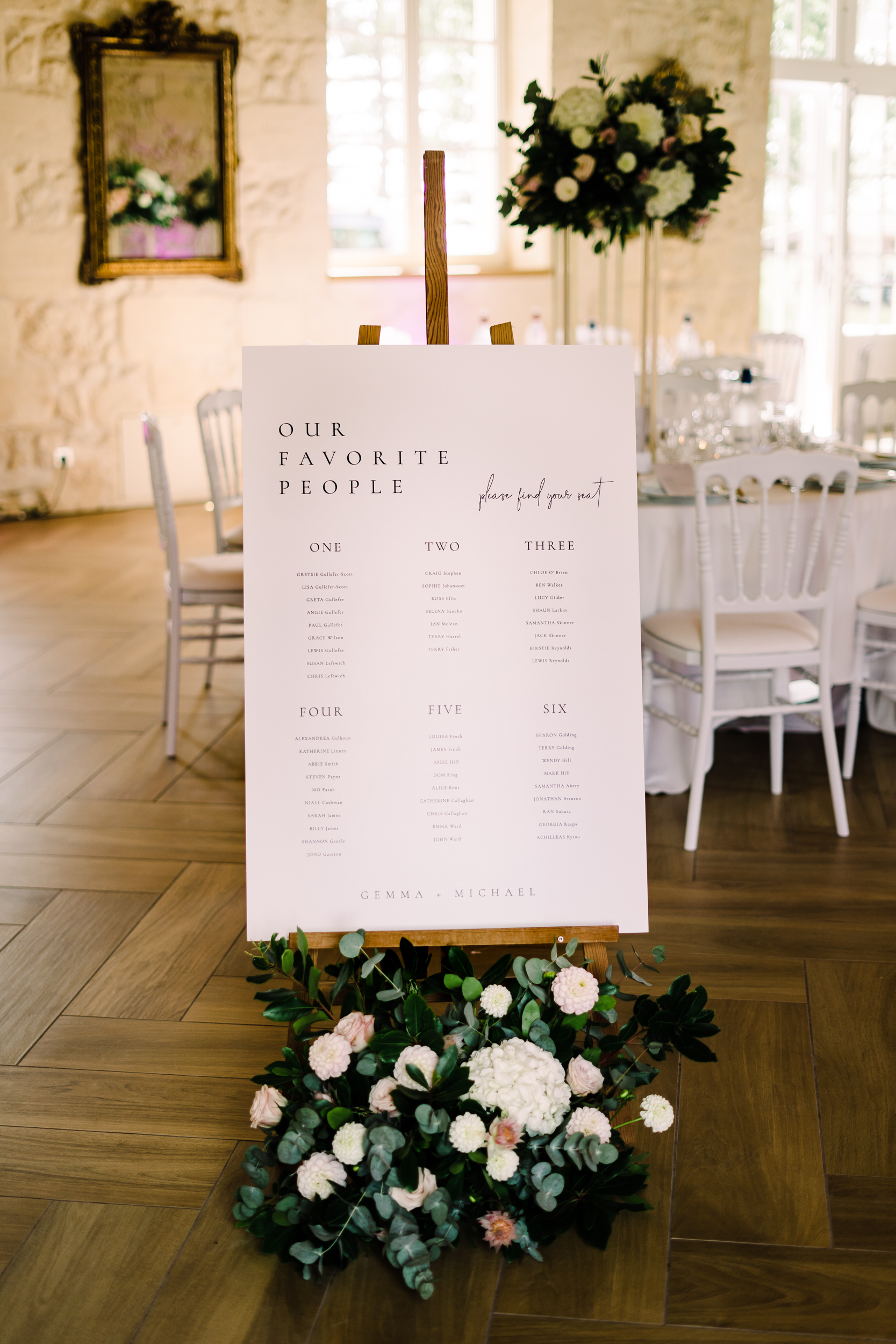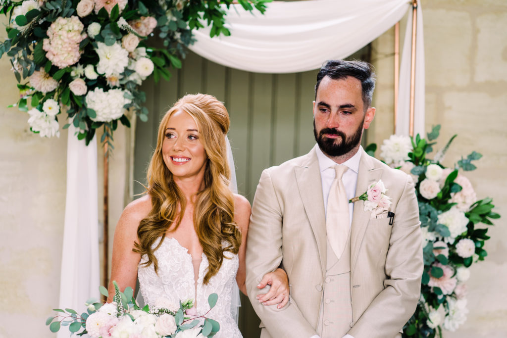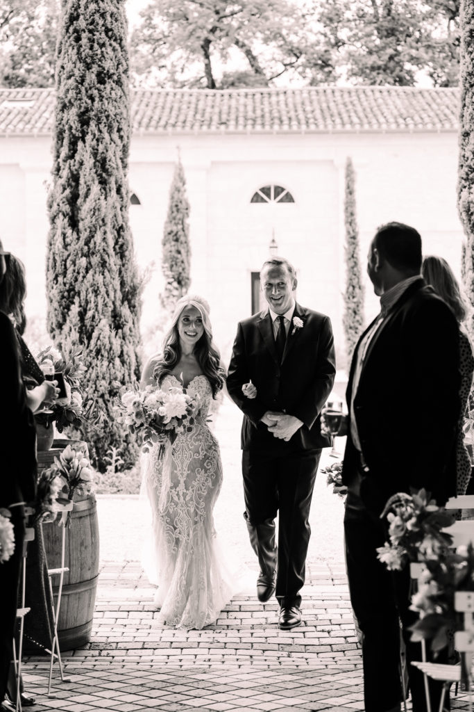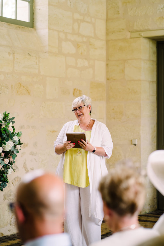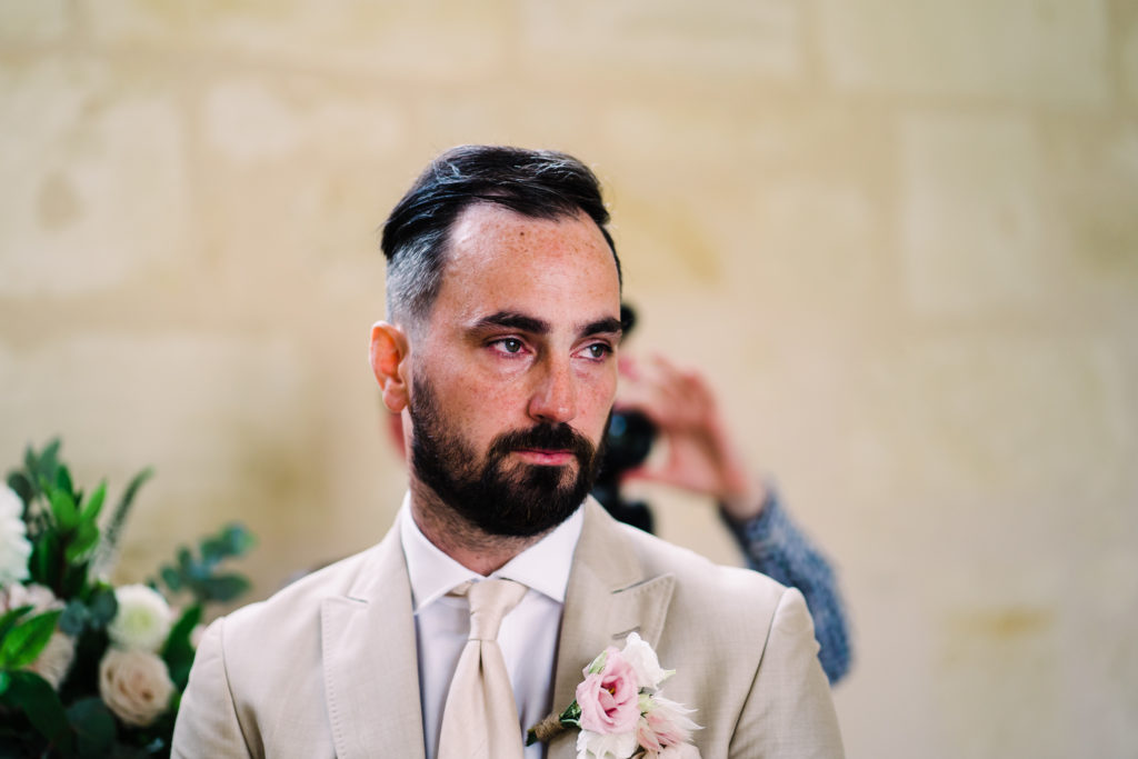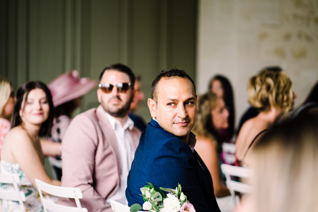 The chateau on its own is an incredible backdrop. But the details elevated the venues aesthetic even further. My favourite part of the ceremony set-up is the simple backdrop. A copper frame, with elegant draping and asymmetrical floral design. The stunning flower arrangements are the handiwork of Pauline from Atelier Septembre. I also loved the nod to the location using name place holders. Bordeaux is known for its wine. Hence why using the corks is a lovely touch.